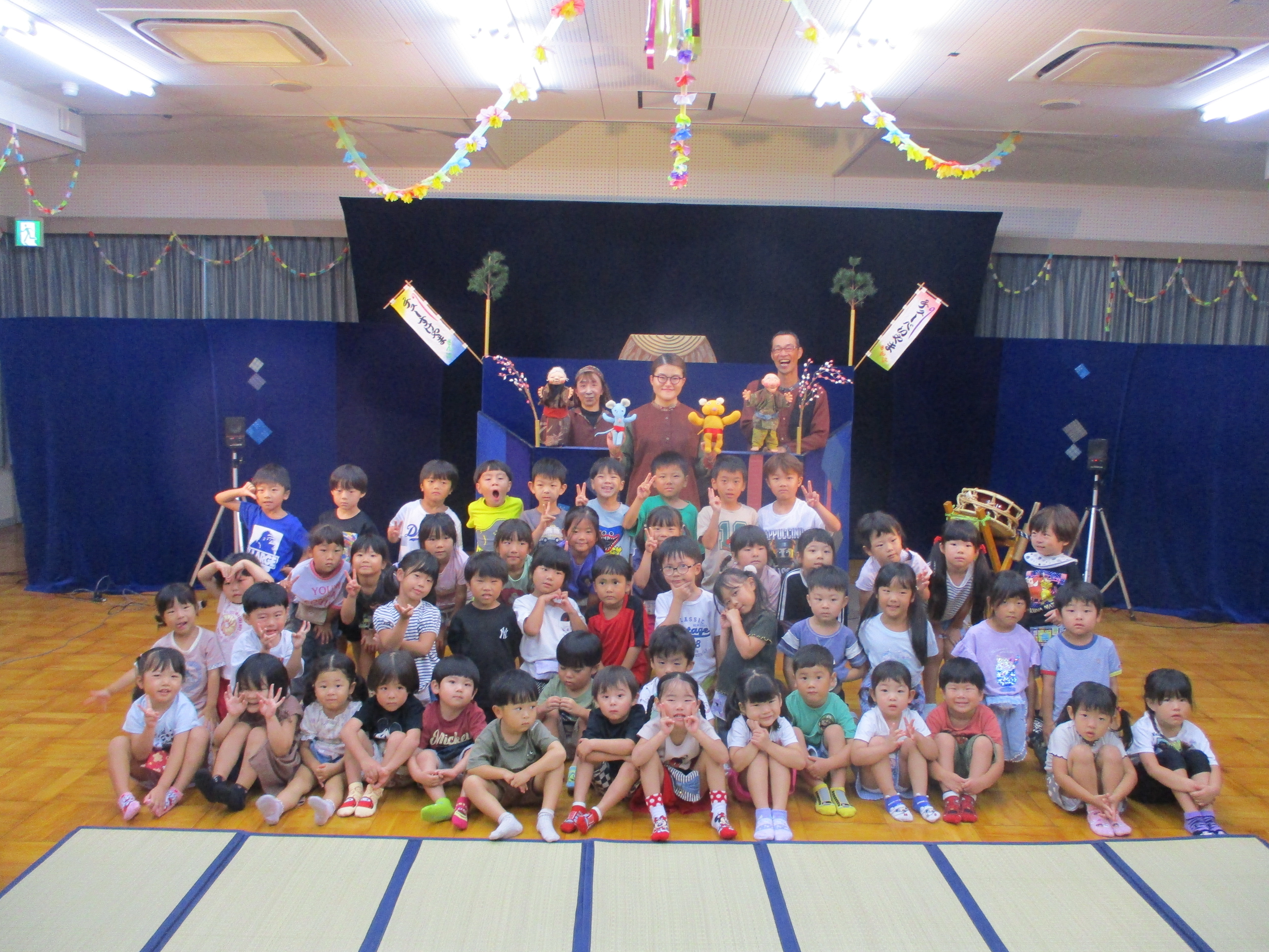 年長児は劇あそび「にじいろのさかな」、年中児は劇あそび「ももたろう」をしました。