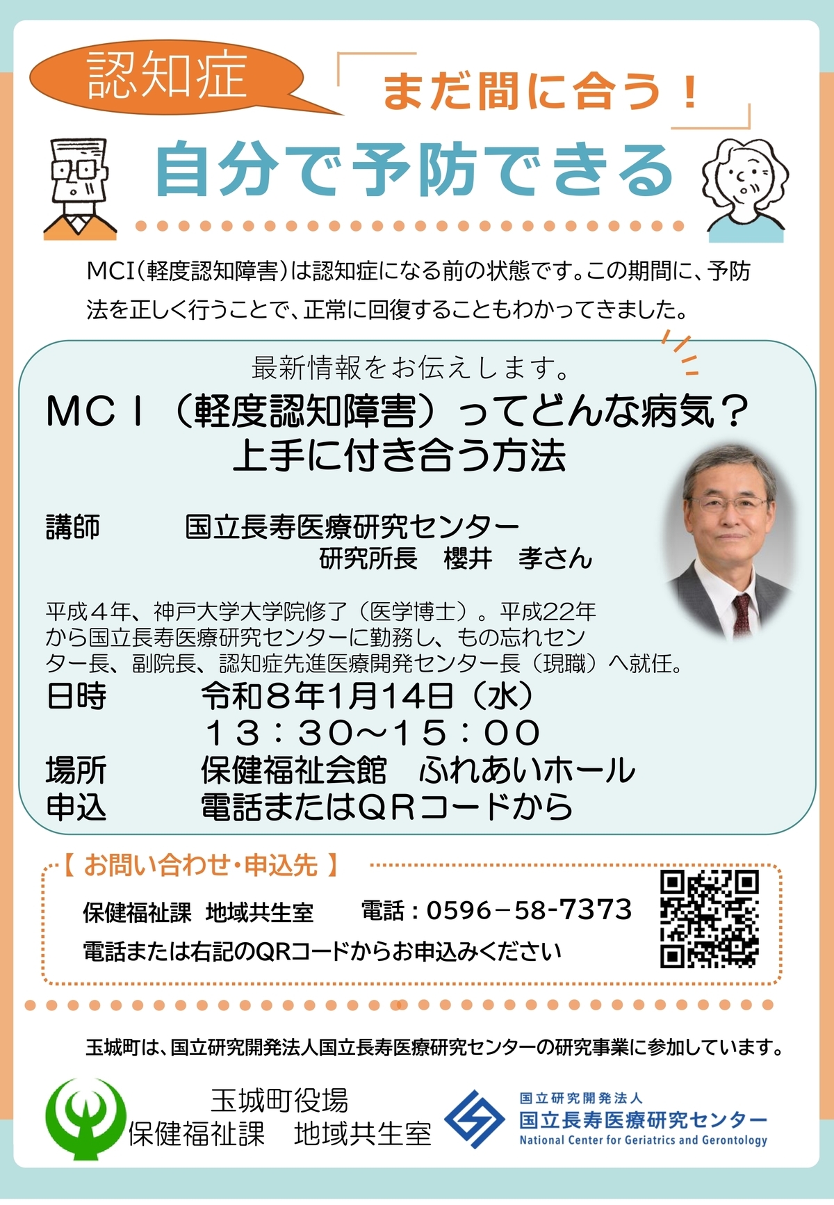 玉城町では、国立長寿医療研究センターと一緒に認知症予防の研究事業に取り組みます。それに先立ち、下記のとおり認知症予防講演会を開催します。