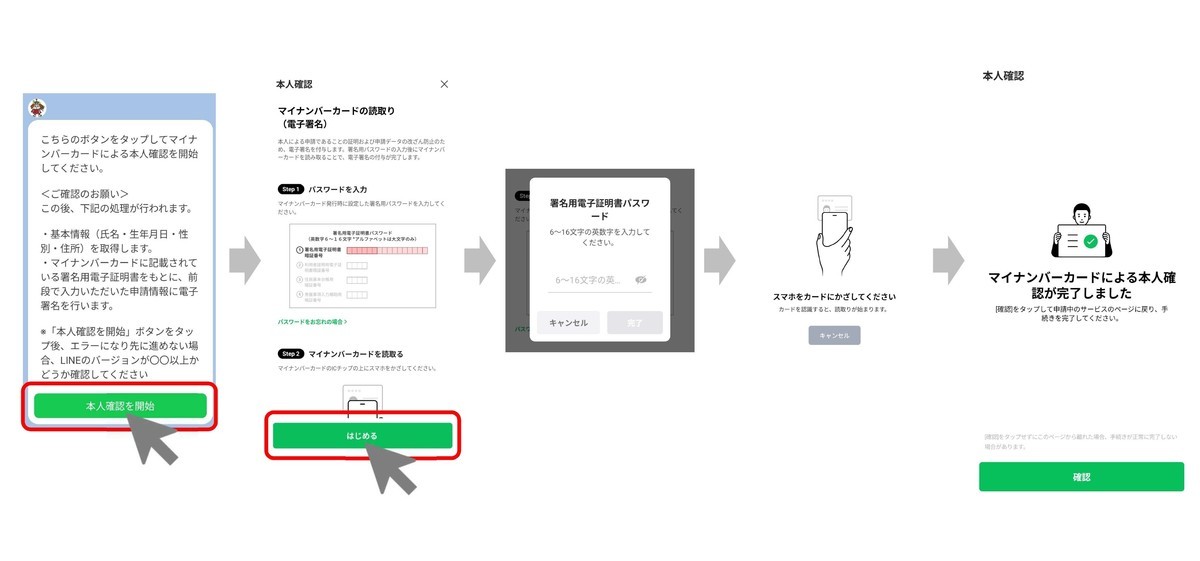 マイナンバーカードを読み取り、公的個人認証による本人確認を行います。