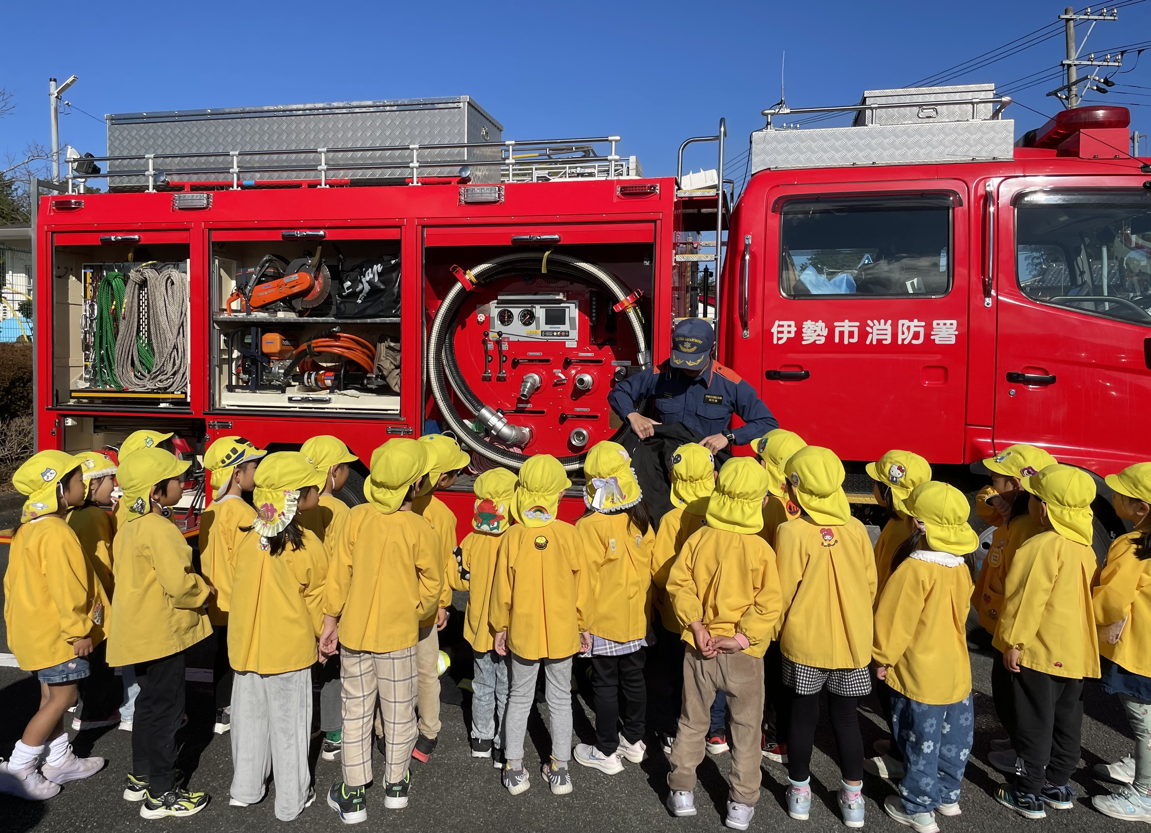 伊勢消防署の玉城出張所さんが来てくれ、避難訓練・消火訓練の様子を見ていただきました。お話を聞かせてくれたり緊急車両を見せてくれました。