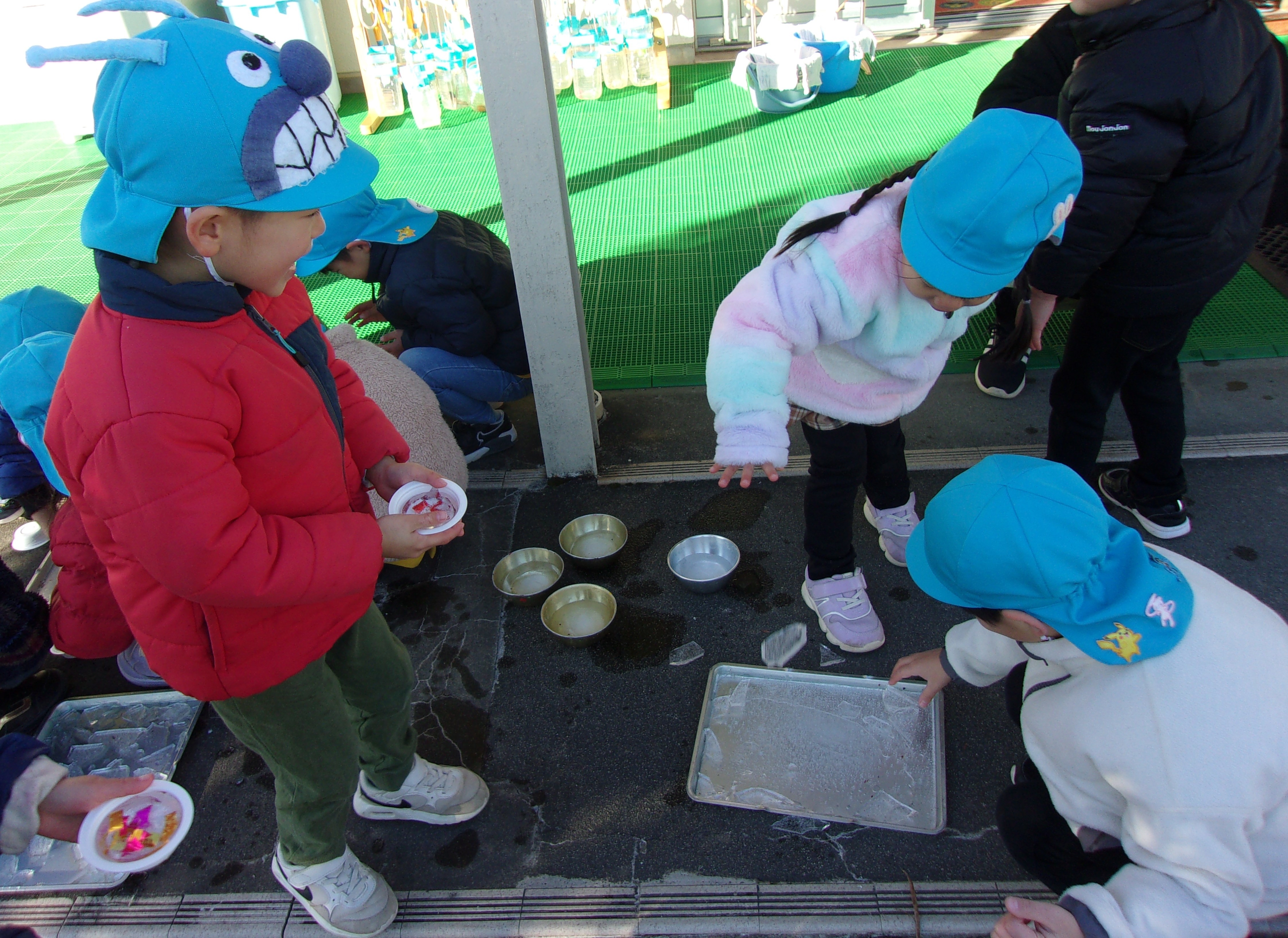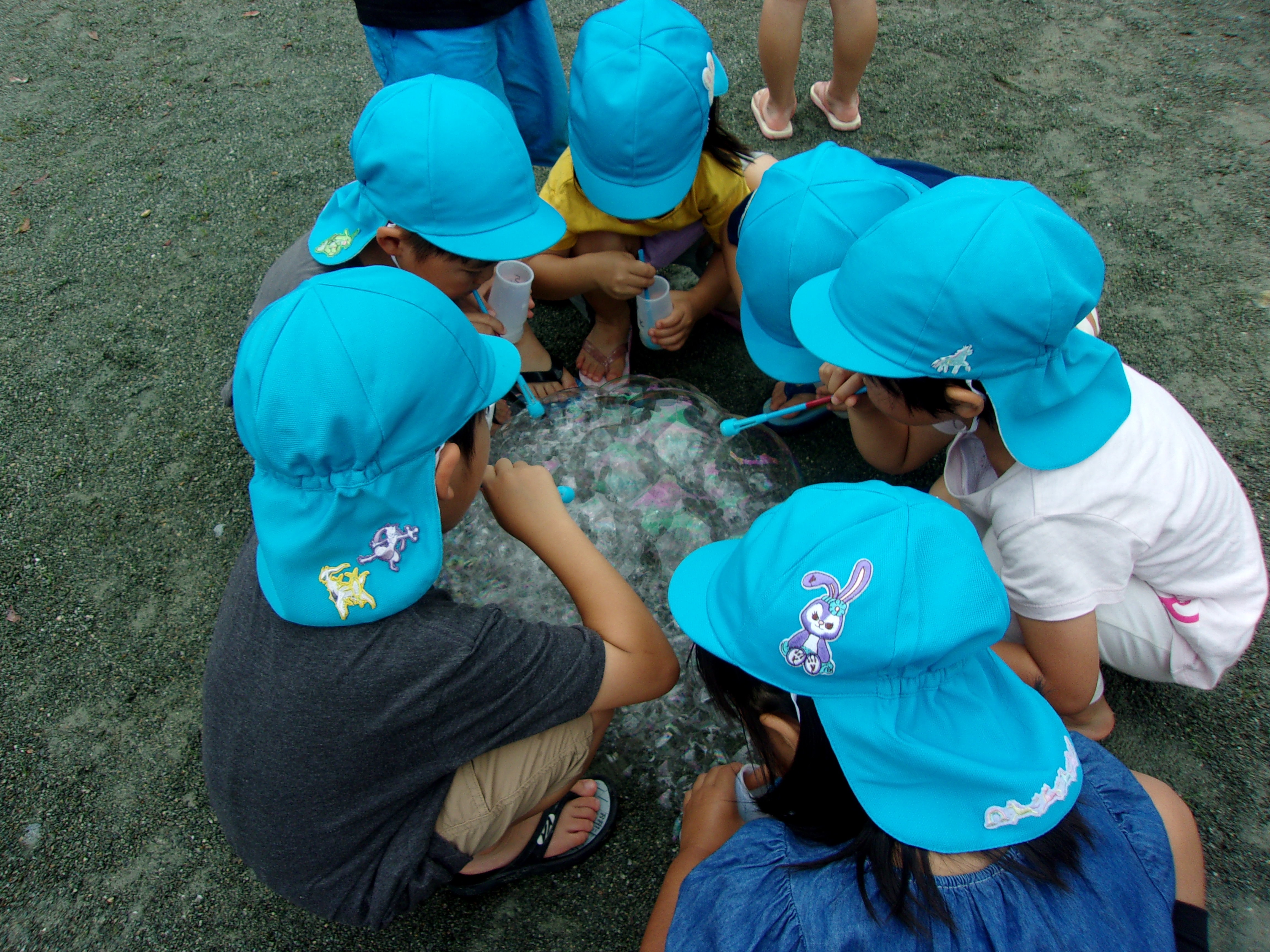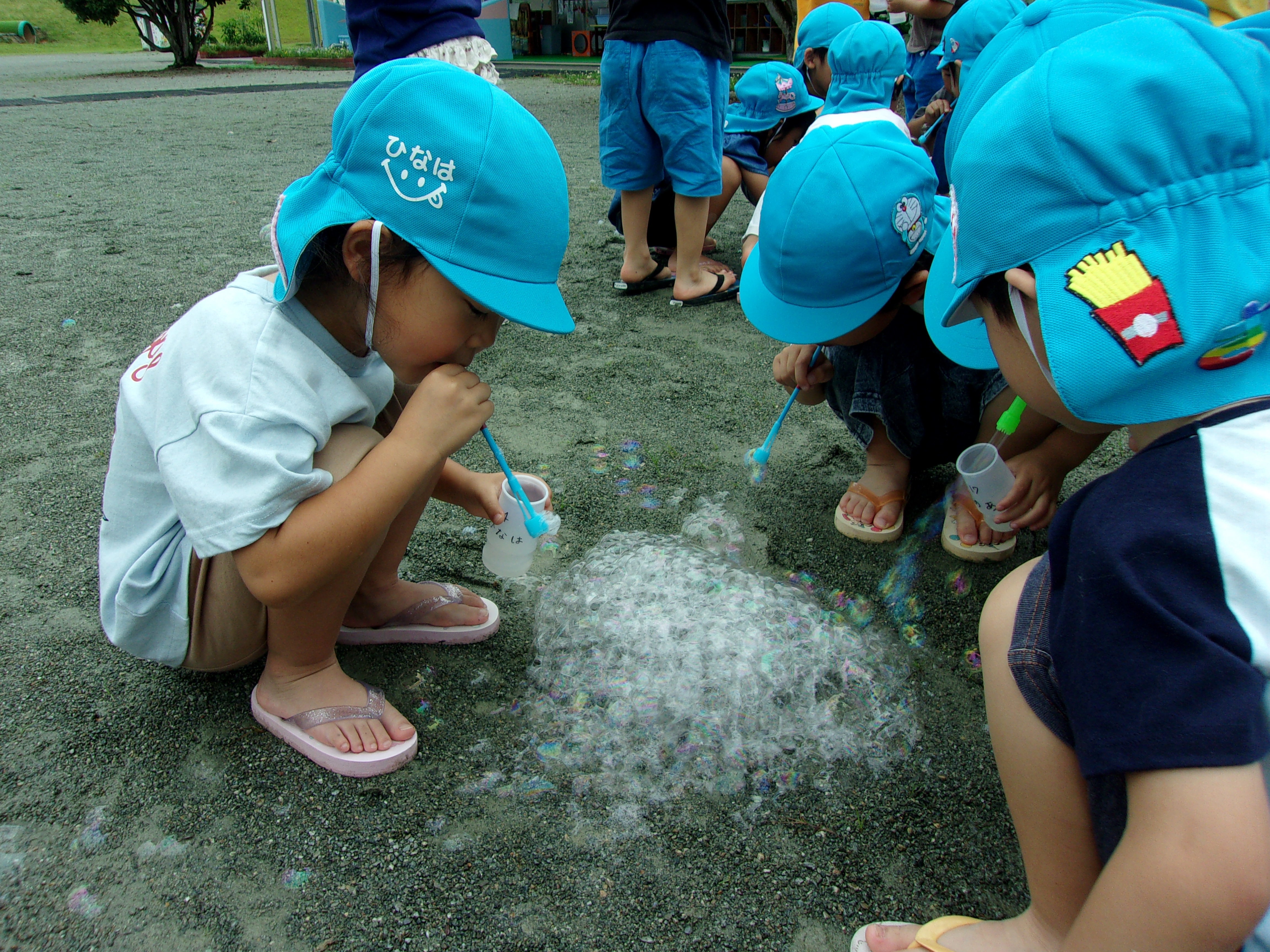 雨上がりで、地面に吹いたしゃぼん玉が割れずにくっつくことに気づいてからは、みんなで地面に吹き、しゃぼん玉の大きな山ができました!