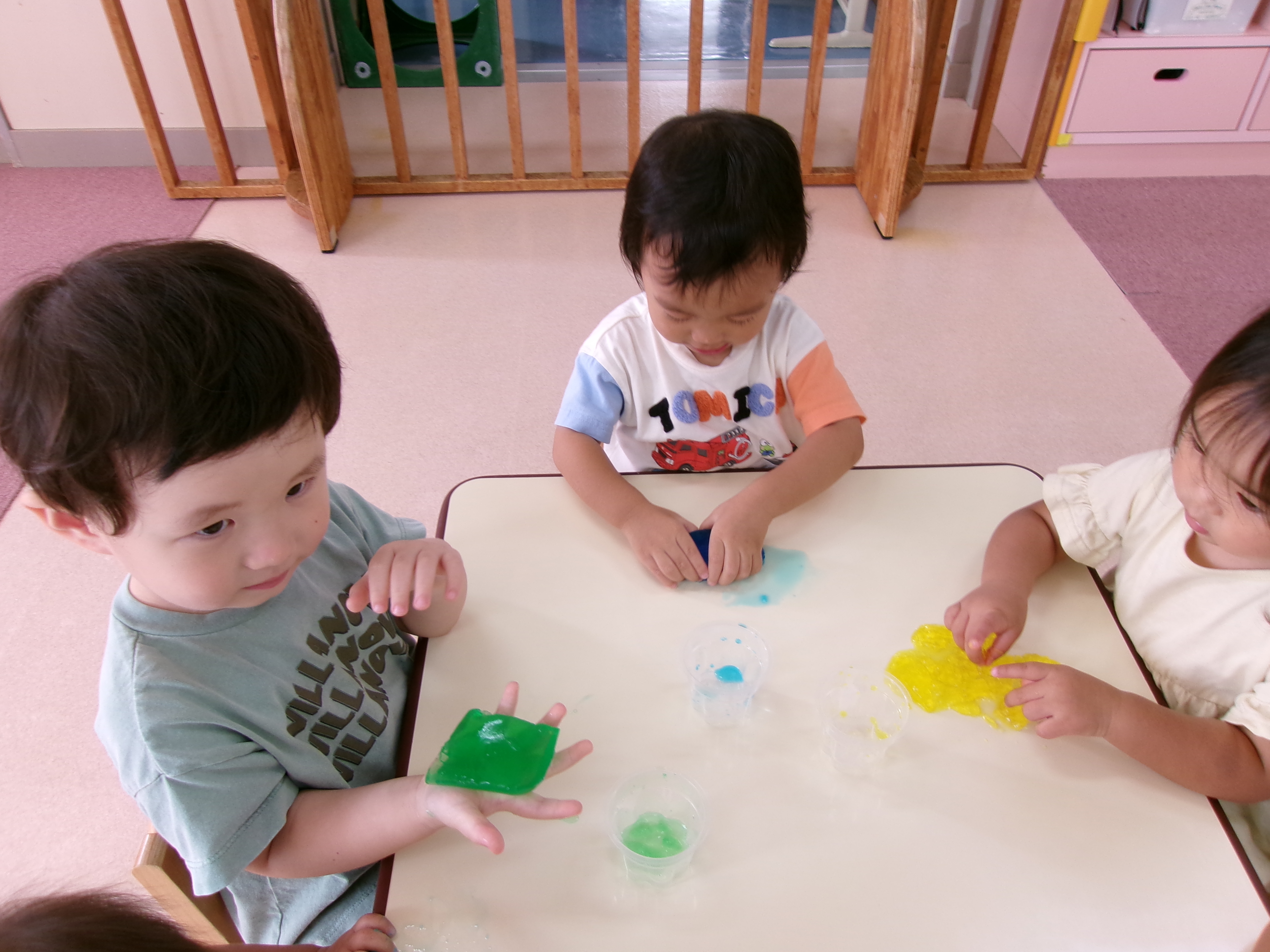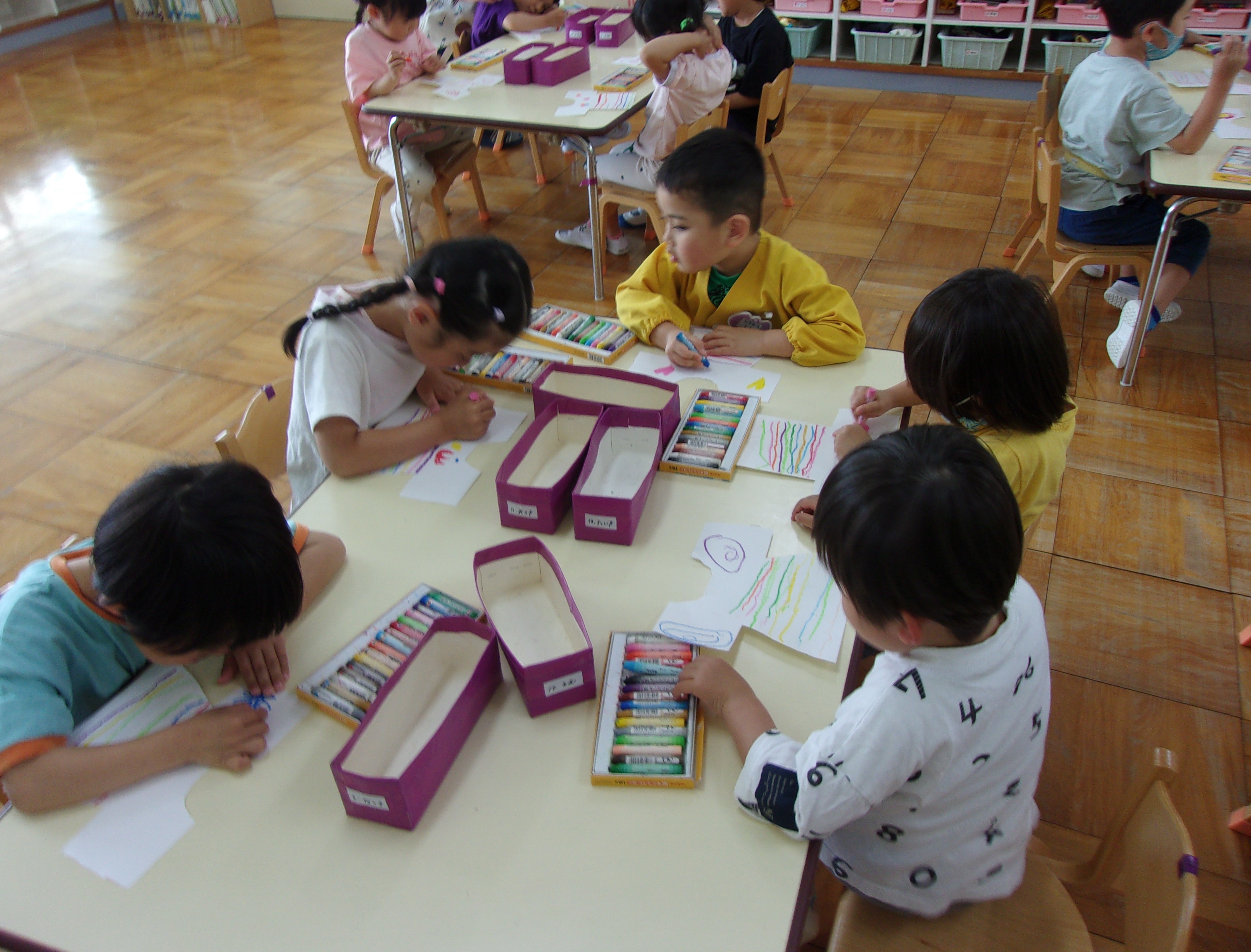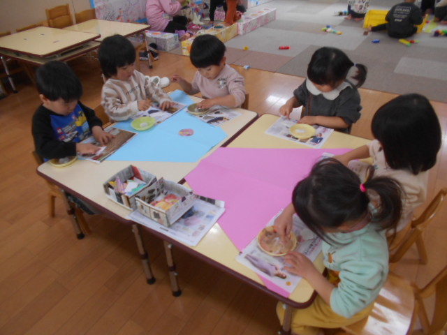 のりを使って牛乳パックに画用紙を貼りました(*^_^*)「べたべたするなぁ~」「いっぱいぬれた~」と言いながら画用紙いっぱいにのりを付けていました☆