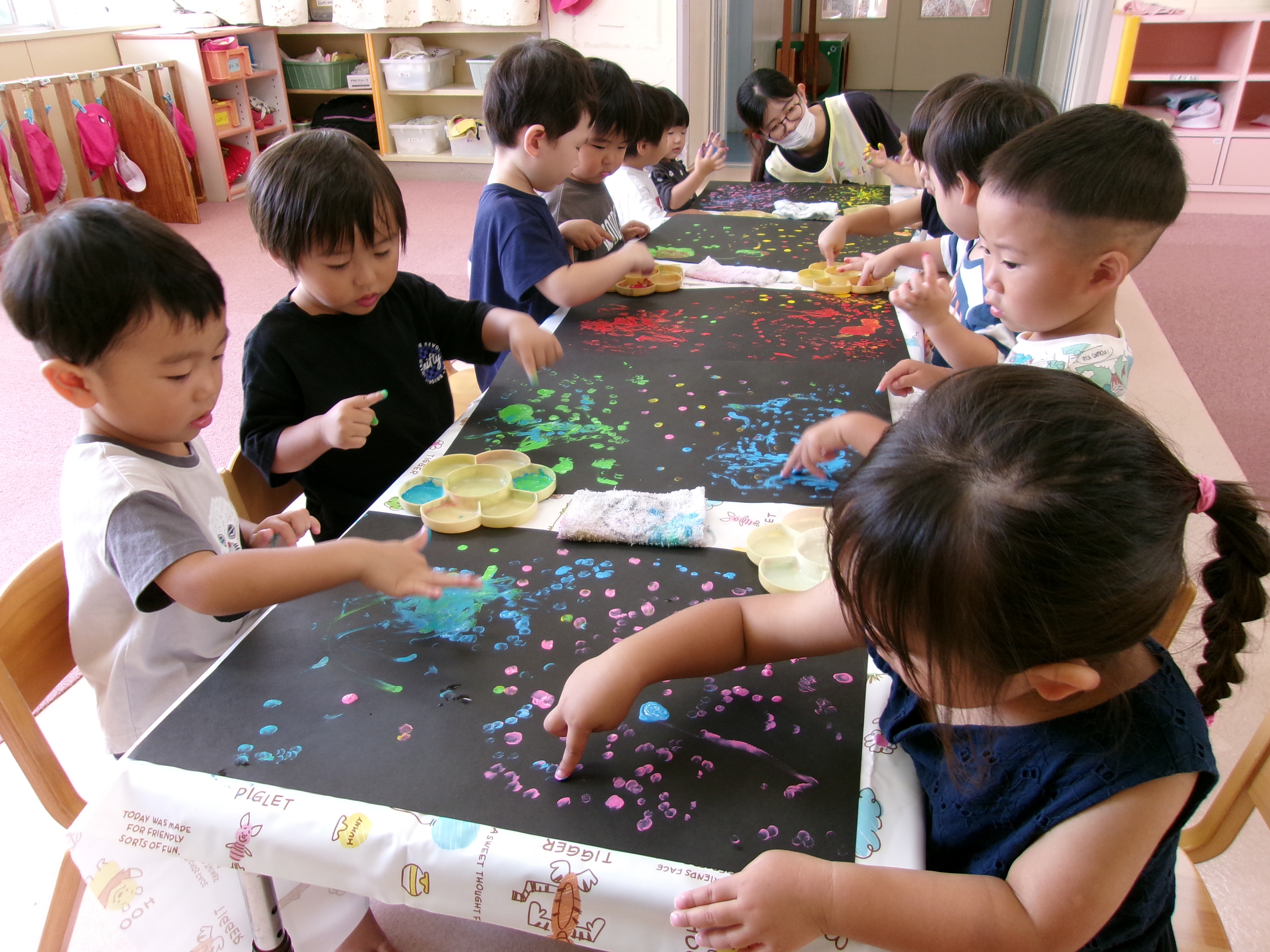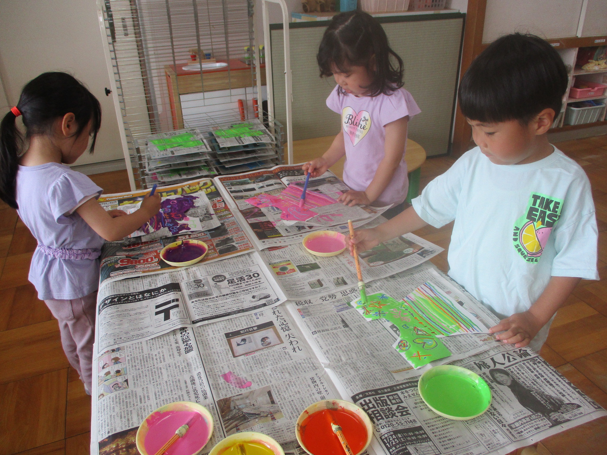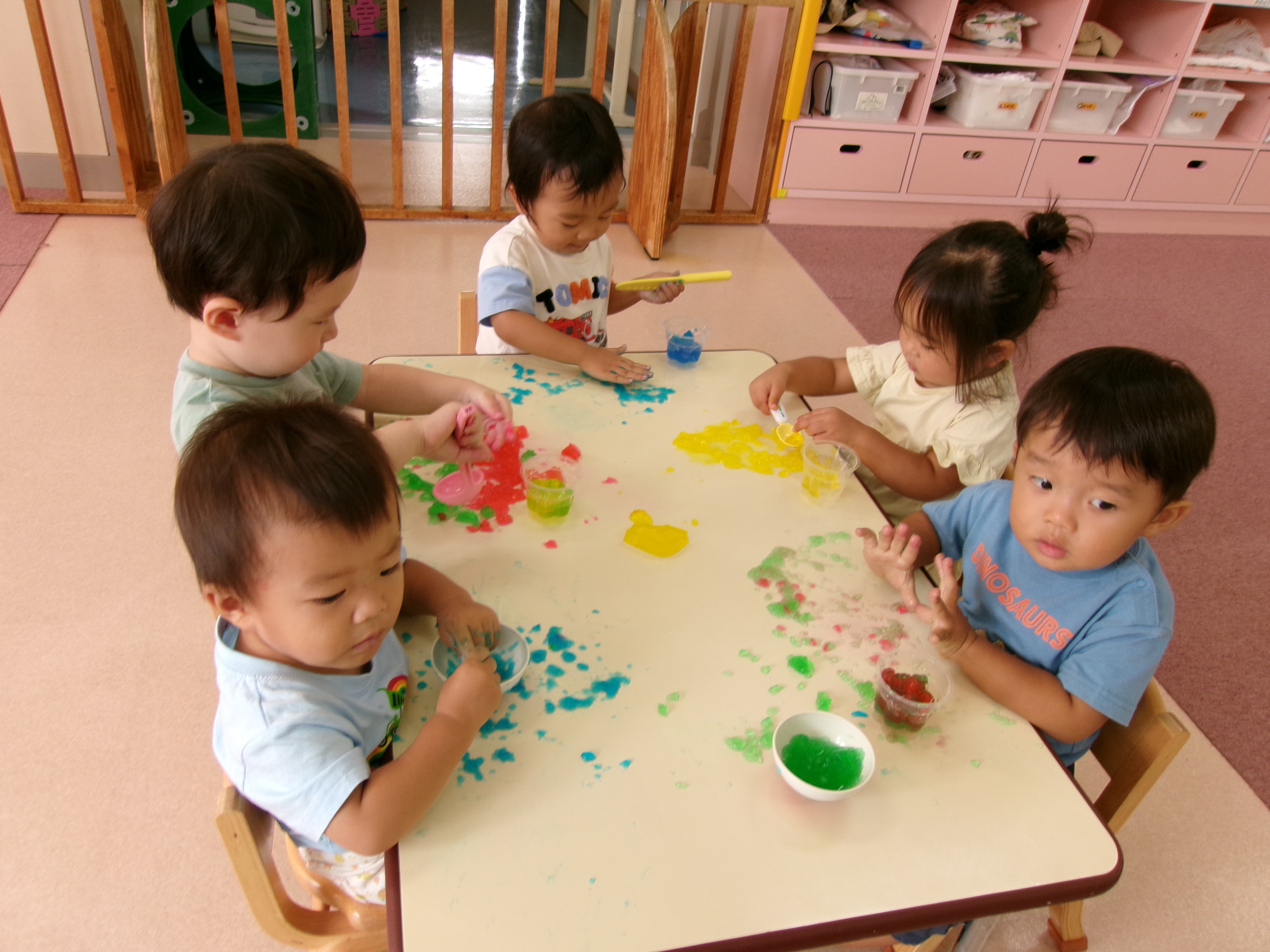 のりを使って牛乳パックに画用紙を貼りました(*^_^*)「べたべたするなぁ~」「いっぱいぬれた~」と言いながら画用紙いっぱいにのりを付けていました☆