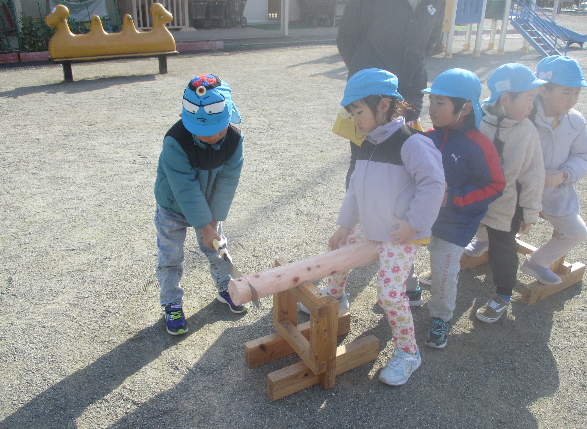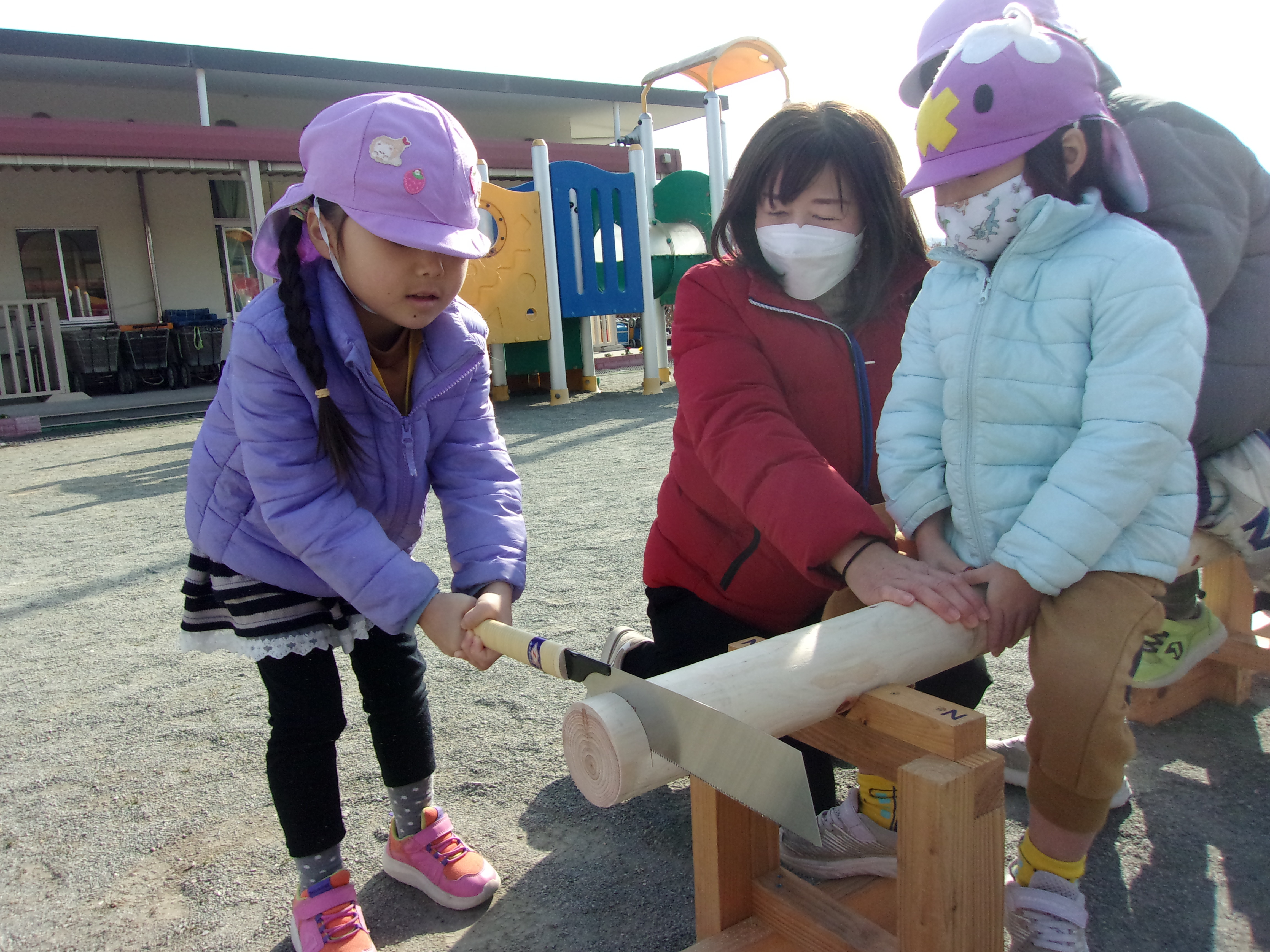 のこぎりでヒノキの丸太切りに挑戦しました☆切っている時はのこぎりをしっかり持って、みんな真剣!