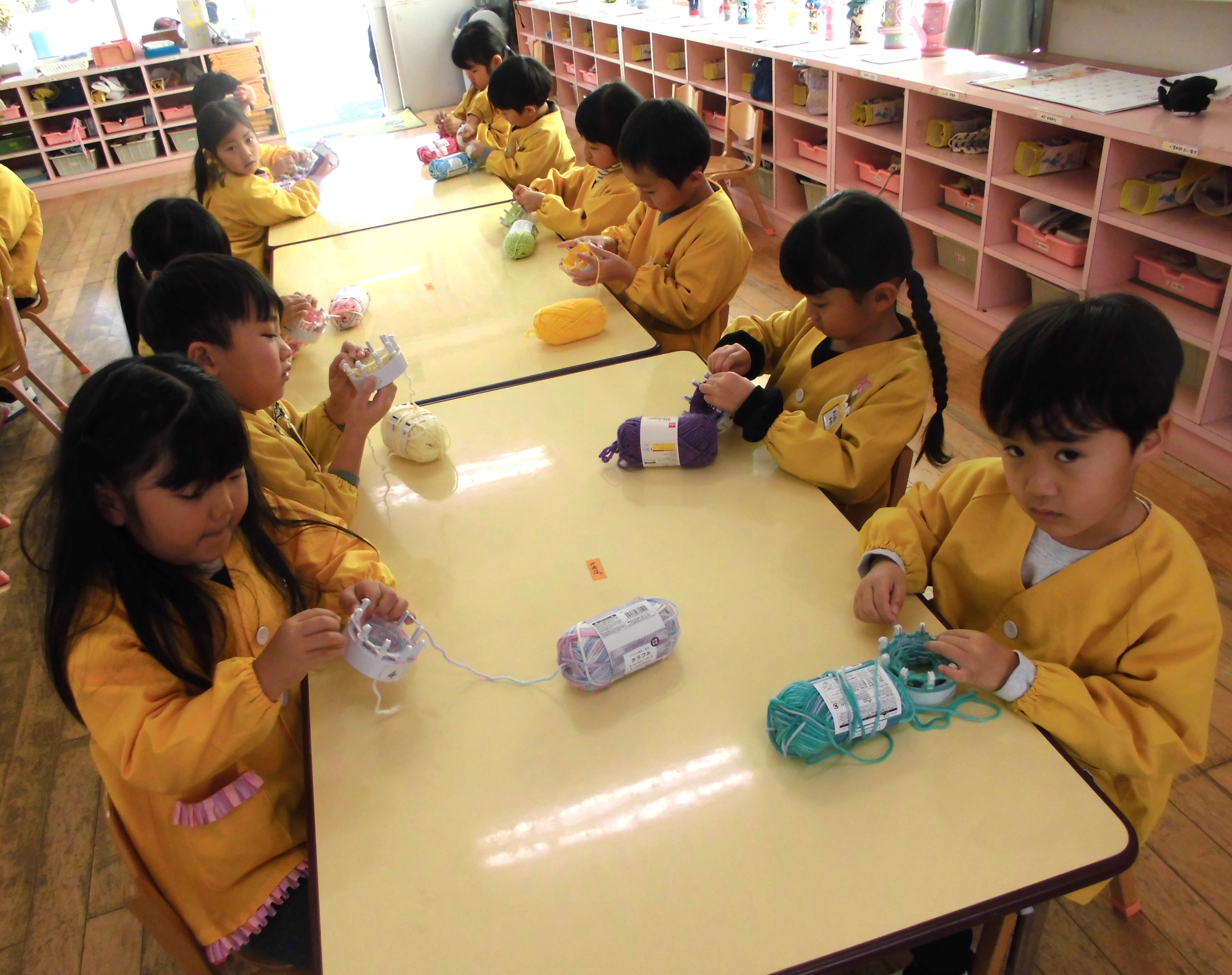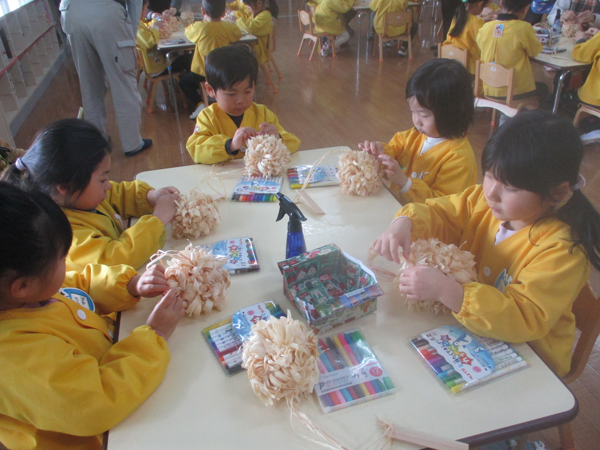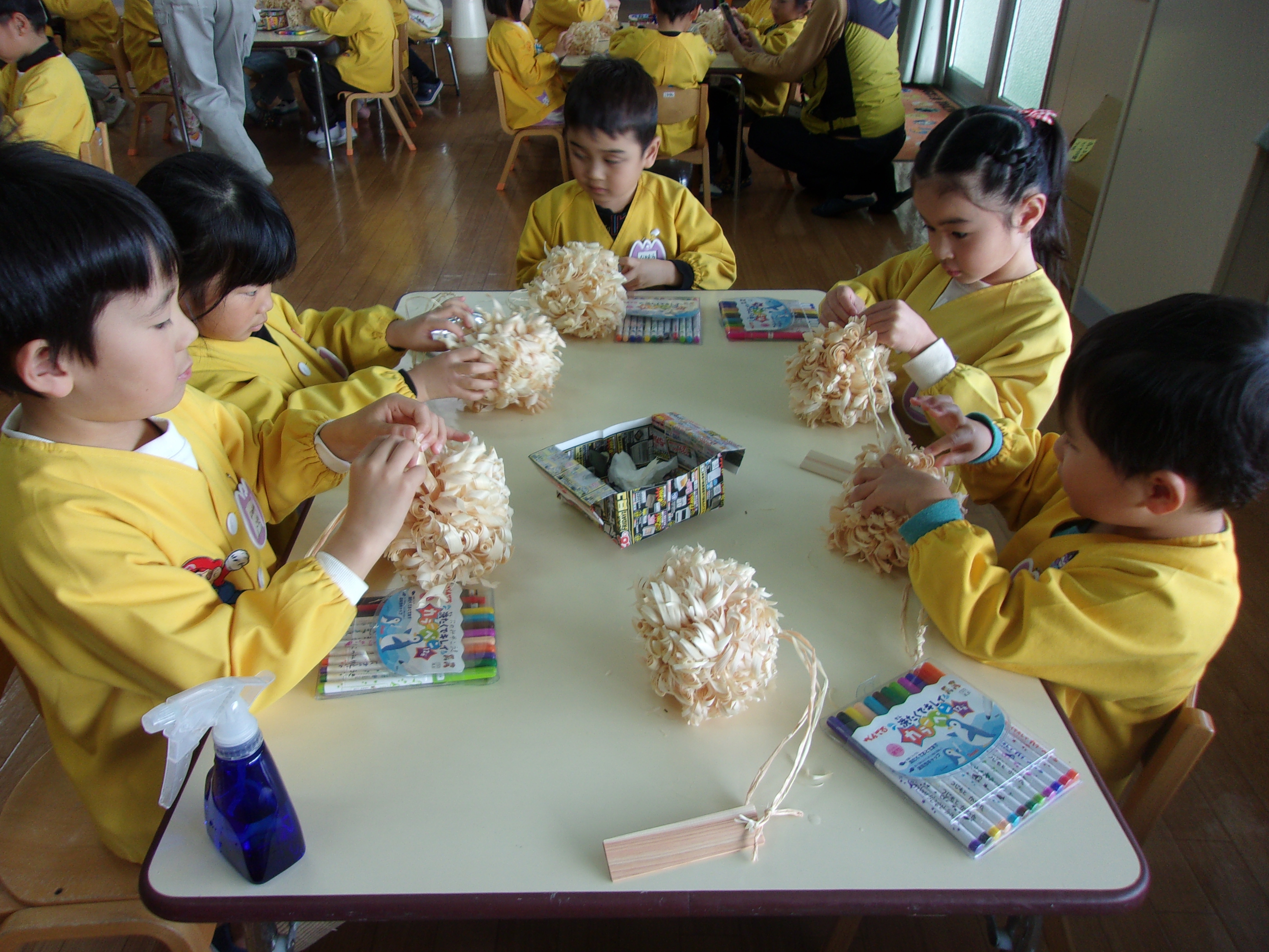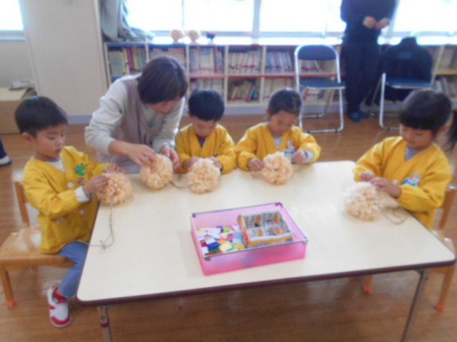 次は遊戯場でヒノキのポンポン作り!