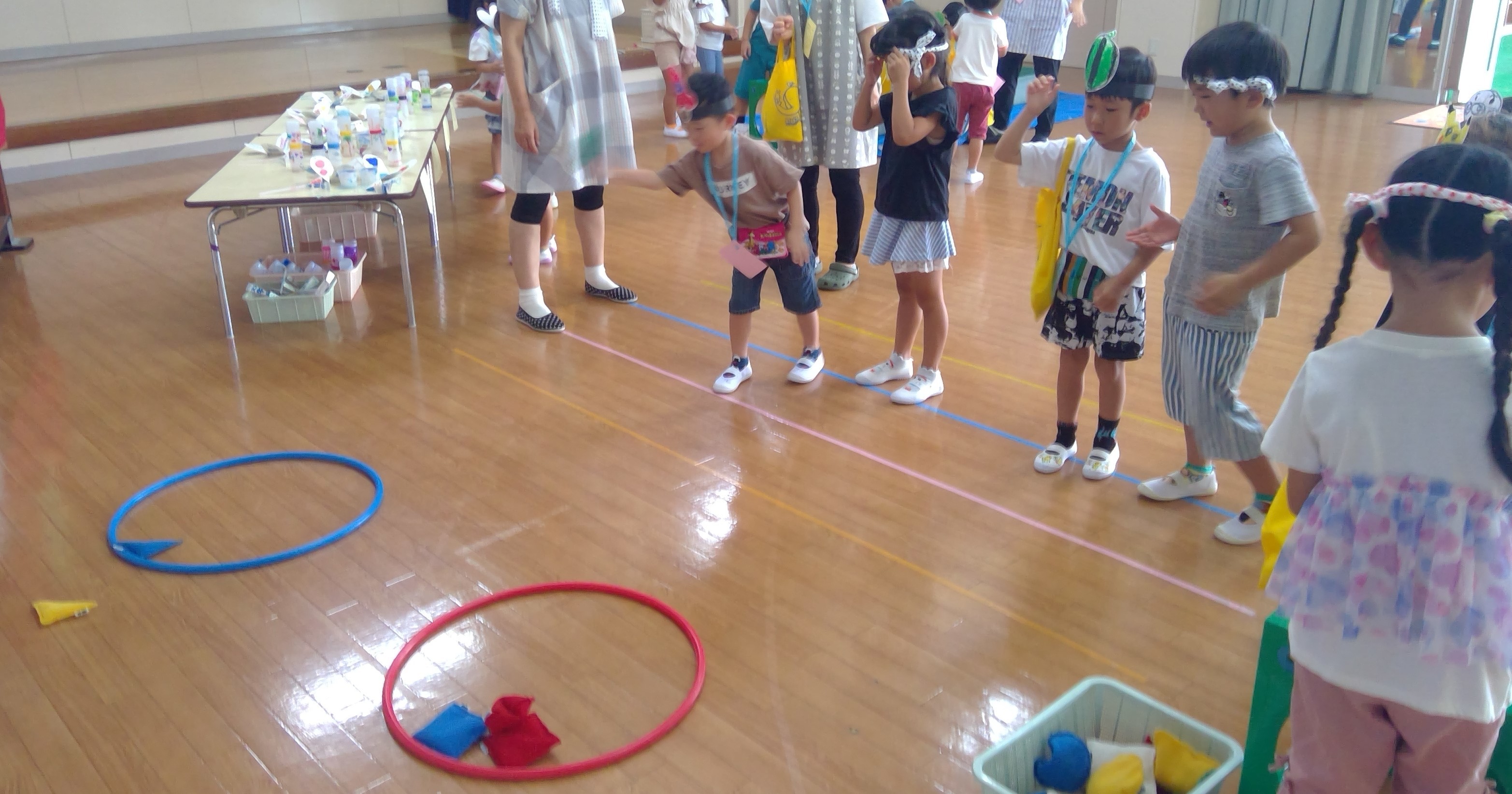 ゲーム屋さんではフラフープの中にビーンズバッグを放り投げて、いくつ入ったかによって好きな手作りおもちゃがもらえました。こまやけん玉、マラカスなどがあり、部屋へ帰ってからみんなで遊びました♪