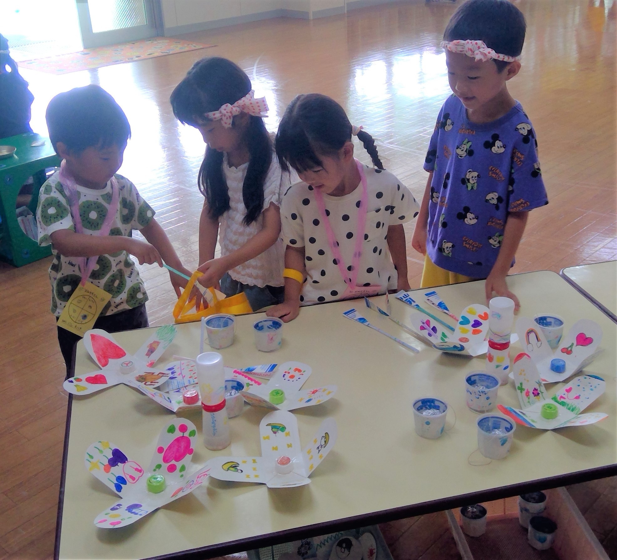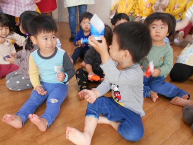 うさぎ組さんには、「こいのぼりひこうき」。りす組さんとひよこ組さんには、「こいのぼりステッキ」をプレゼントしてくれました。