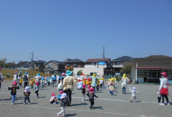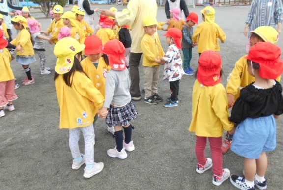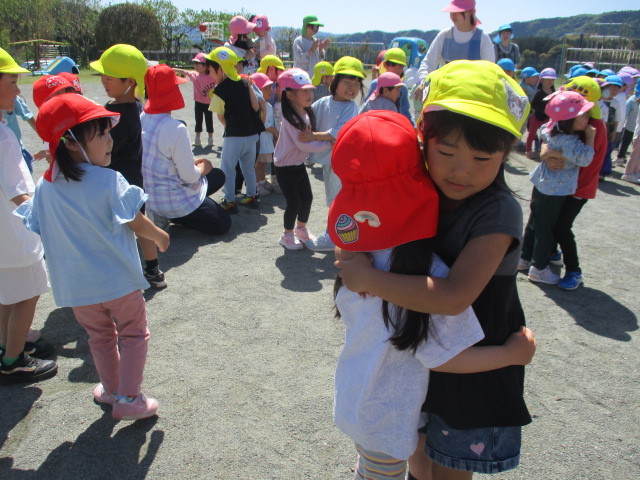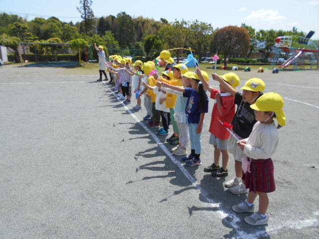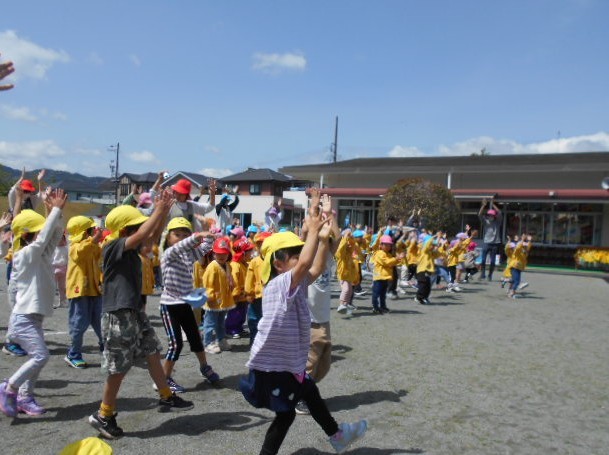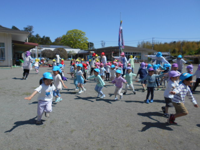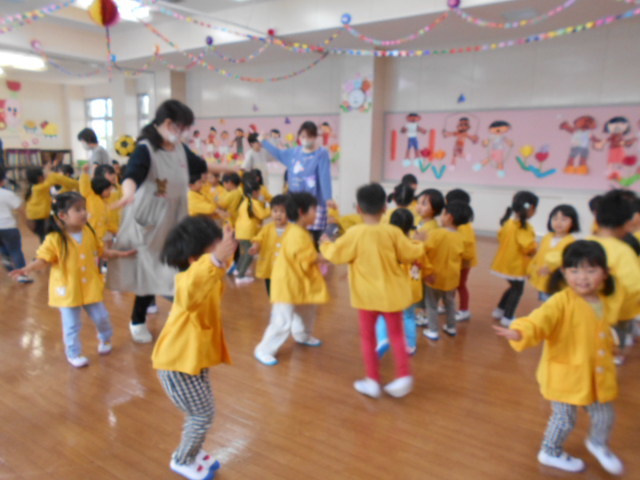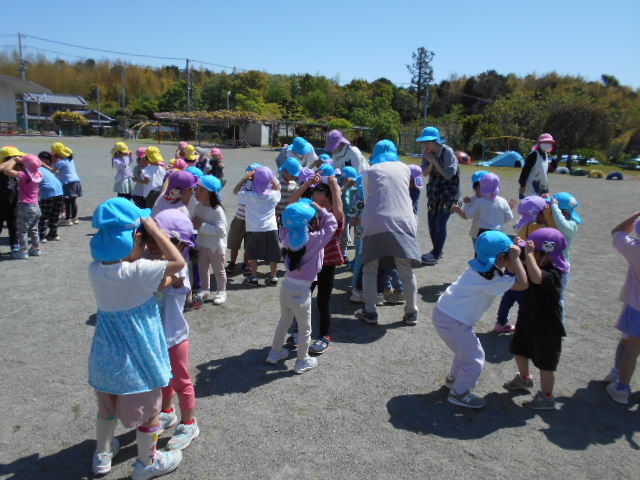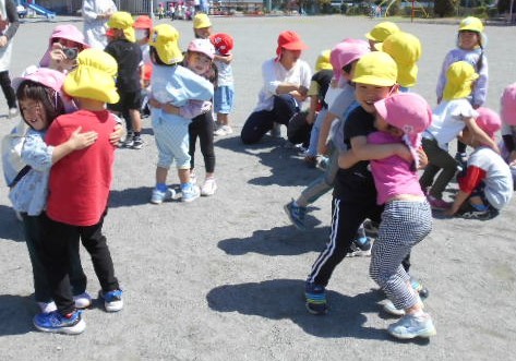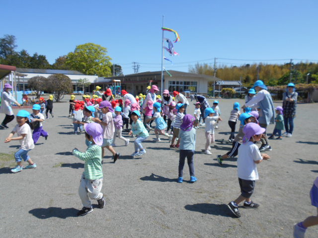 新しい環境に緊張やとまどいを抱えていた子どもたちも園庭に出ると春風が気持ちよく、お兄ちゃんお姉ちゃんたちと一緒に身体を動かすことを楽しんでいます。初めは、見ているだけだったおともだちもお兄ちゃんやお姉ちゃんが踊っていると自然と身体が揺れたり笑顔になったり・・・少しずつ園生活に慣れてきました!