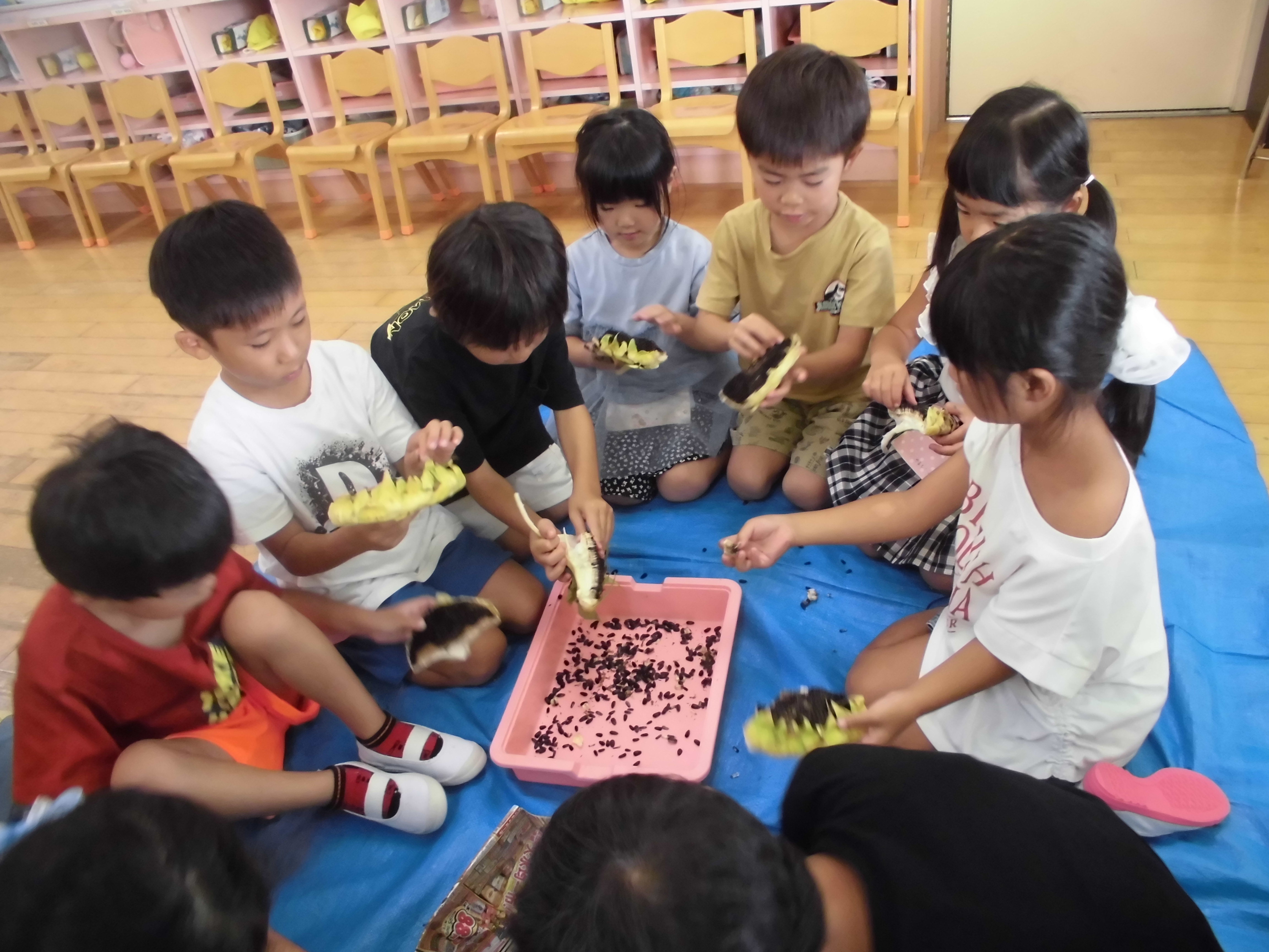 その後、みんなで筋とりにも挑戦したよ♪難しかったけど、上手くとれた時は「やった!」と喜ぶ姿も!