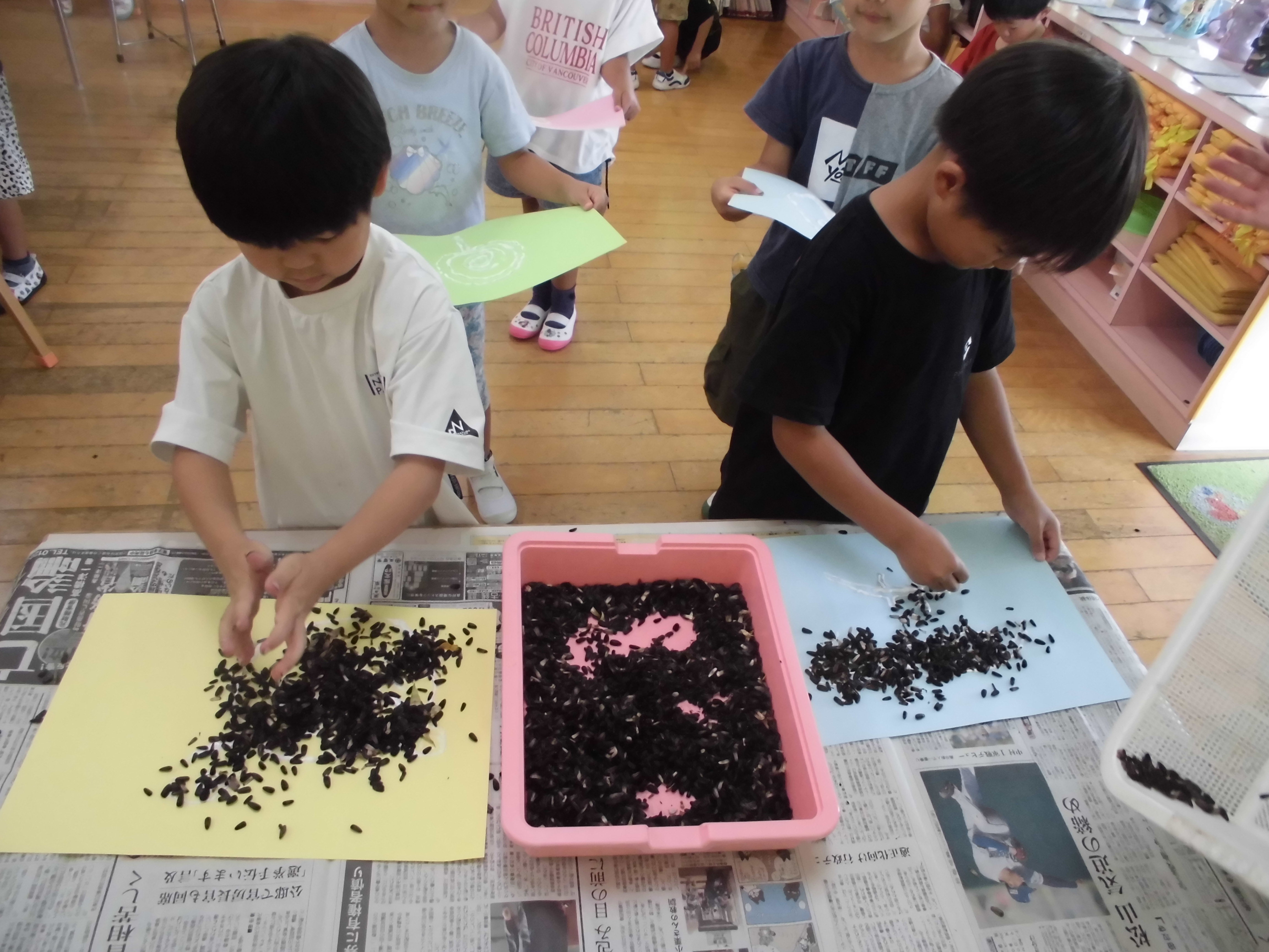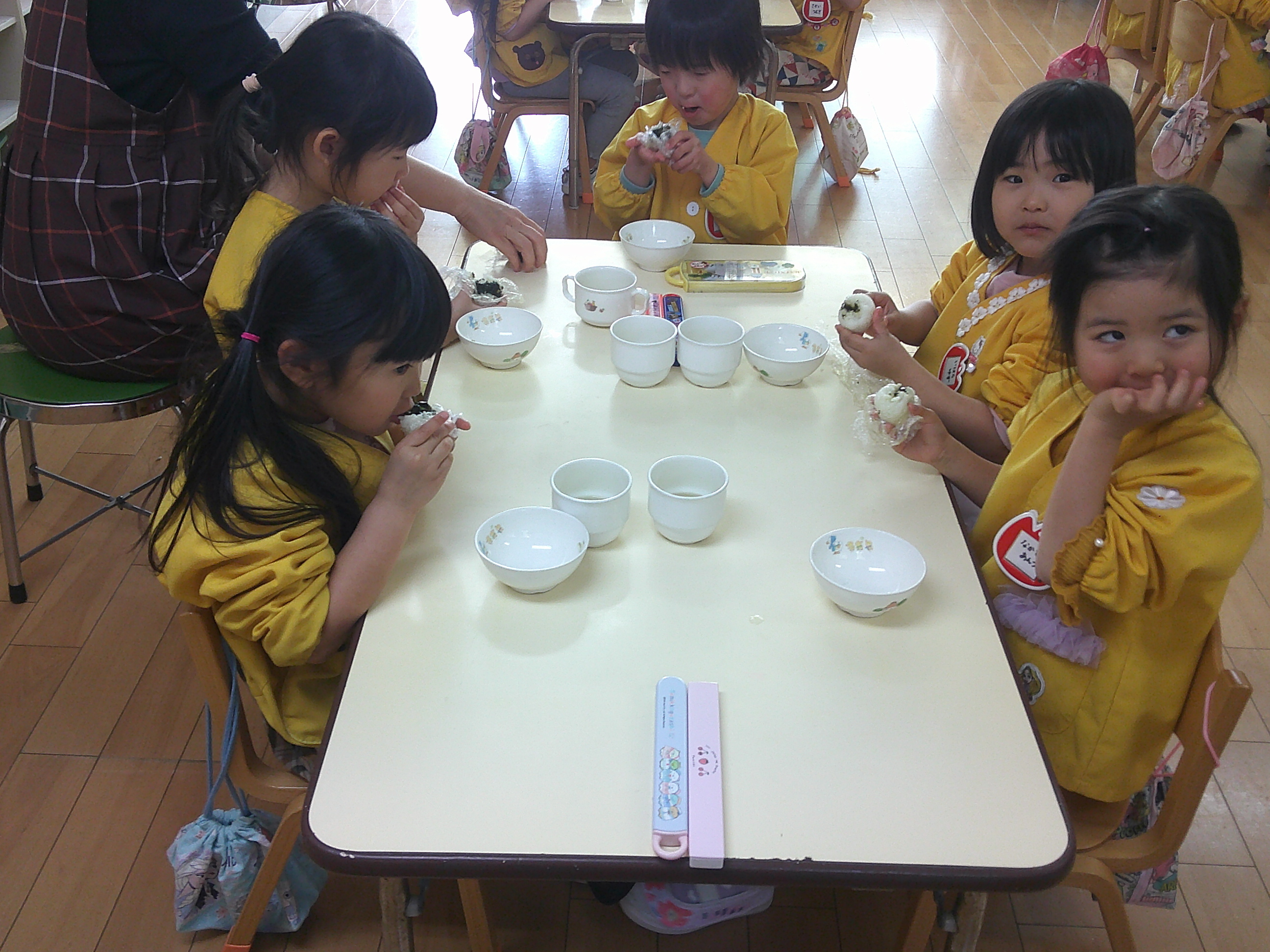 給食の時に、ご飯の上にのせてもらって「ぎゅっぎゅっ♪」と、自分たちでおにぎりを作りました。