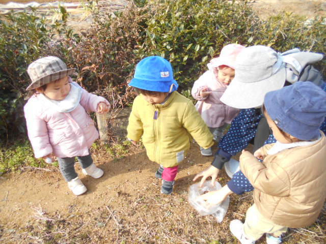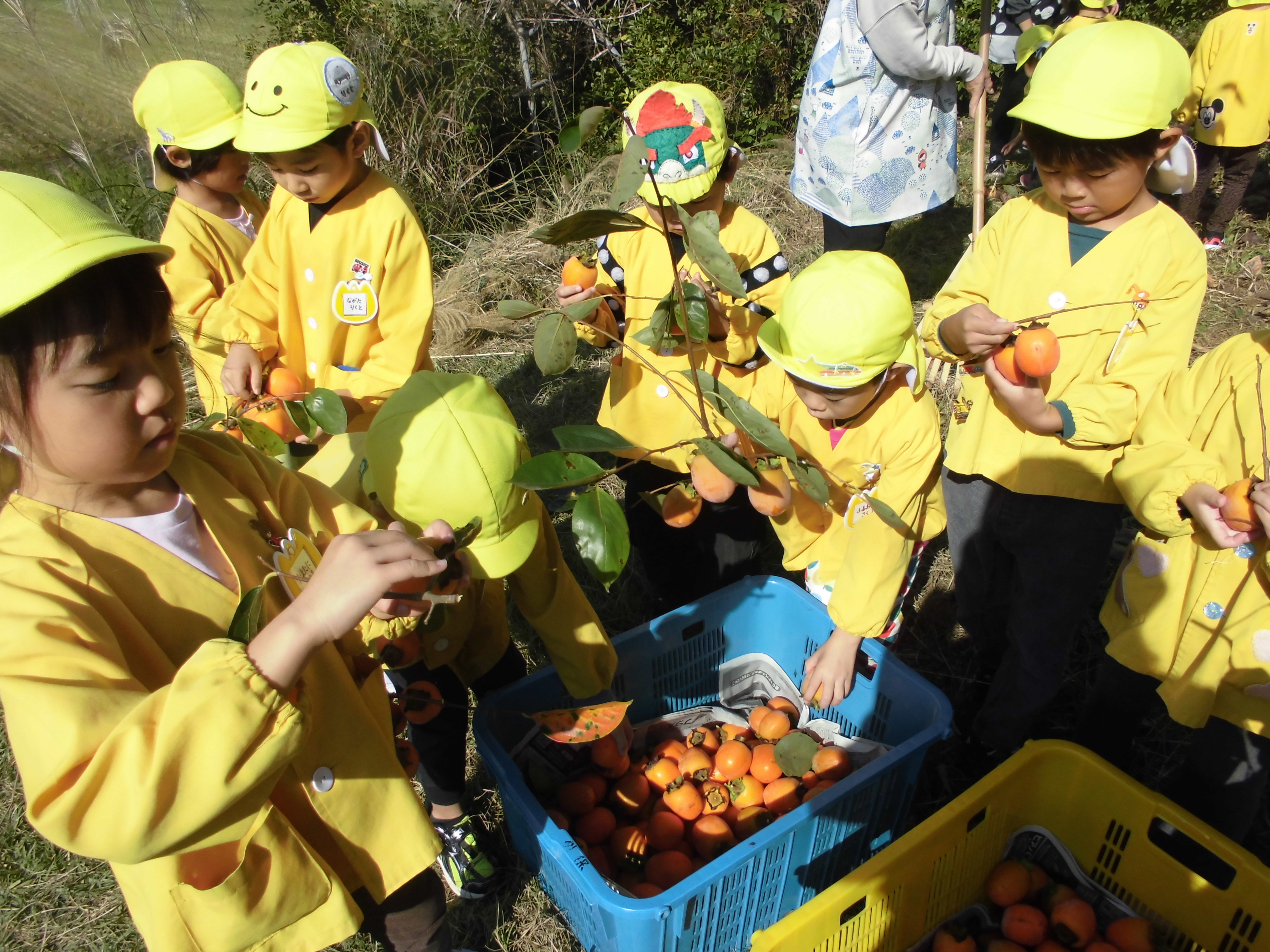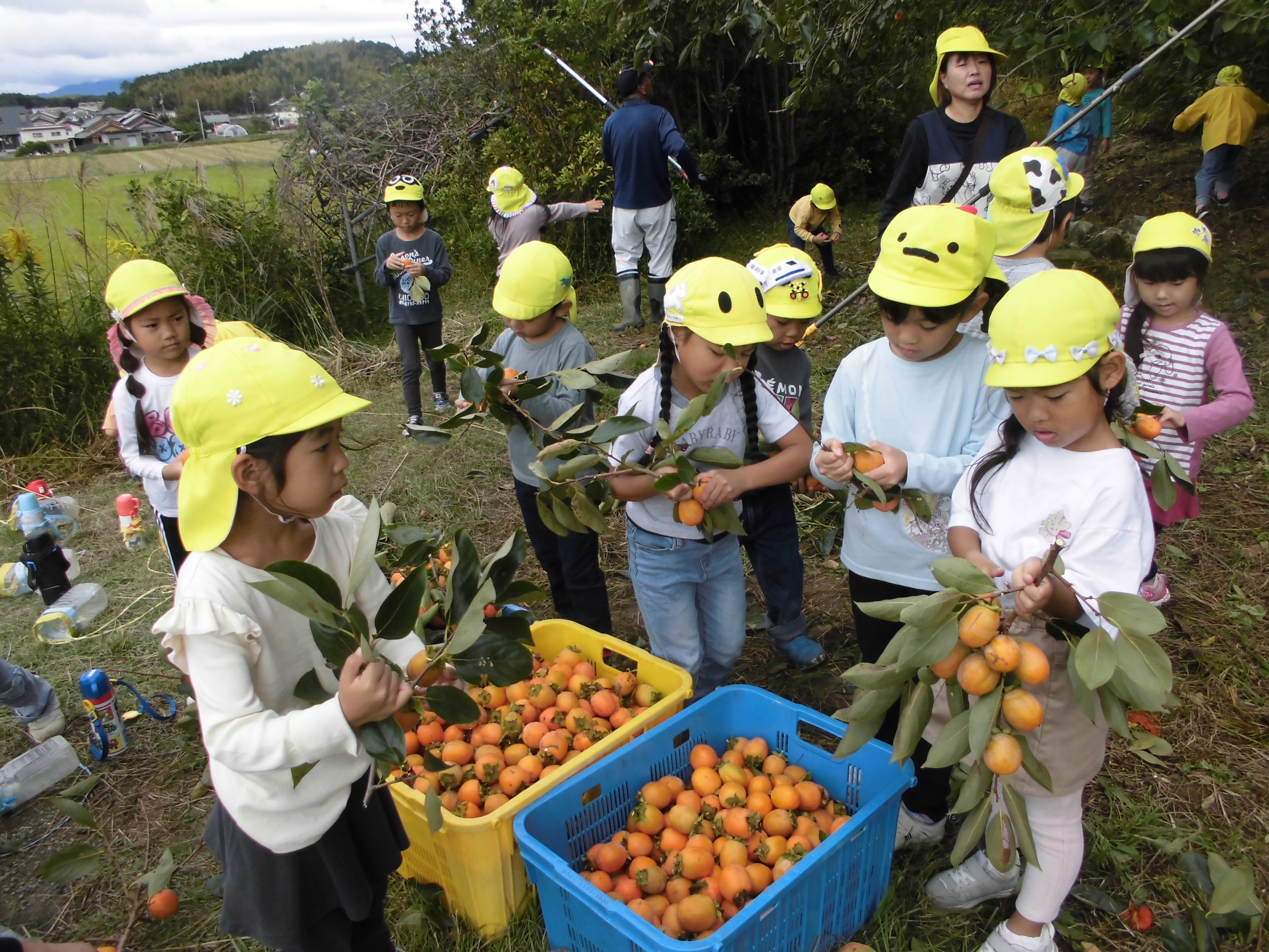 地域の方にお誘いいただき、渋柿とりをさせてもらいました。大人が枝ごととった渋柿を枝から外してかごへ入れていきました。渋柿を回すと簡単に枝から外れるのをおもしろがっていました。