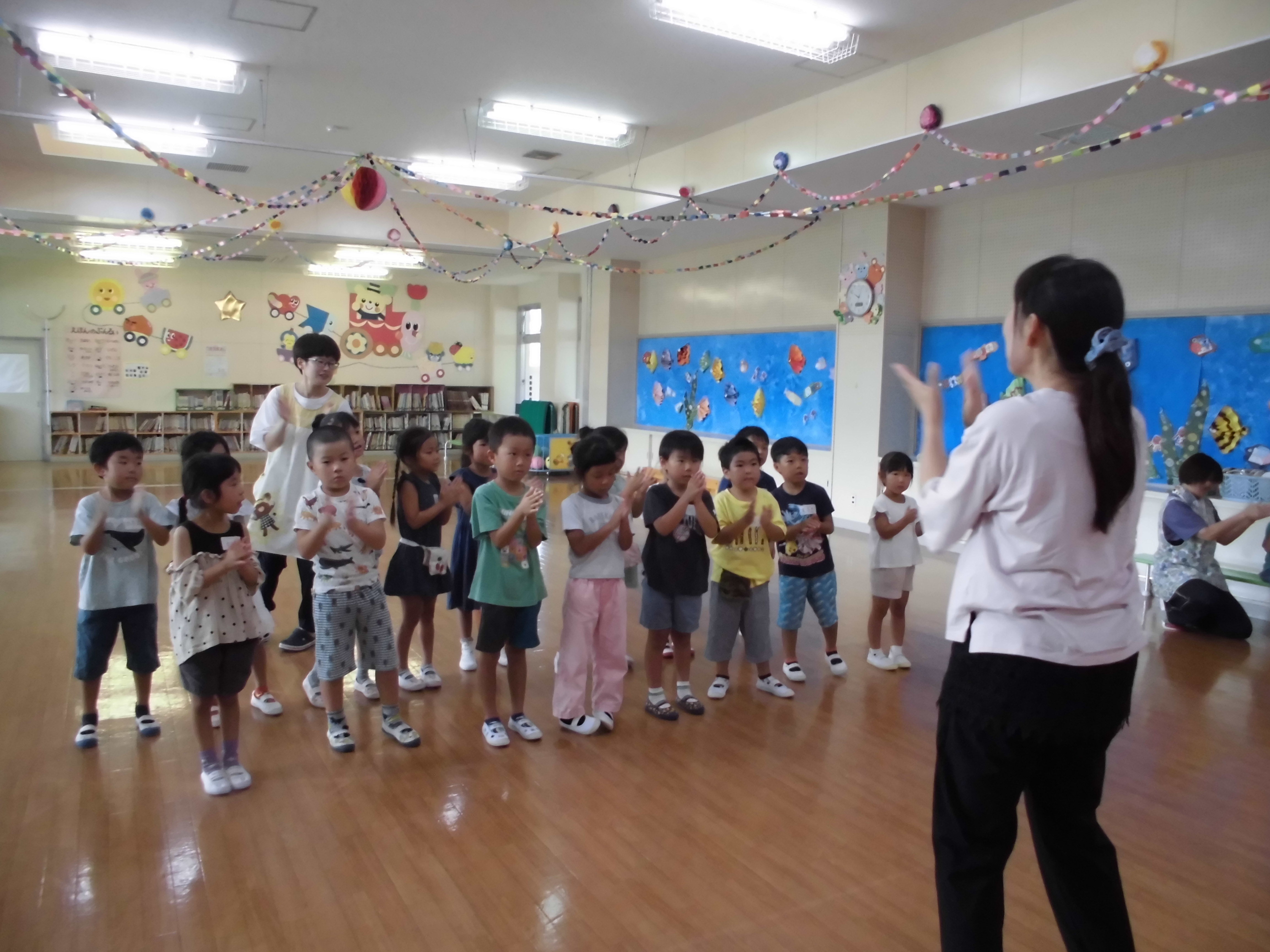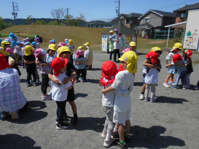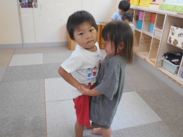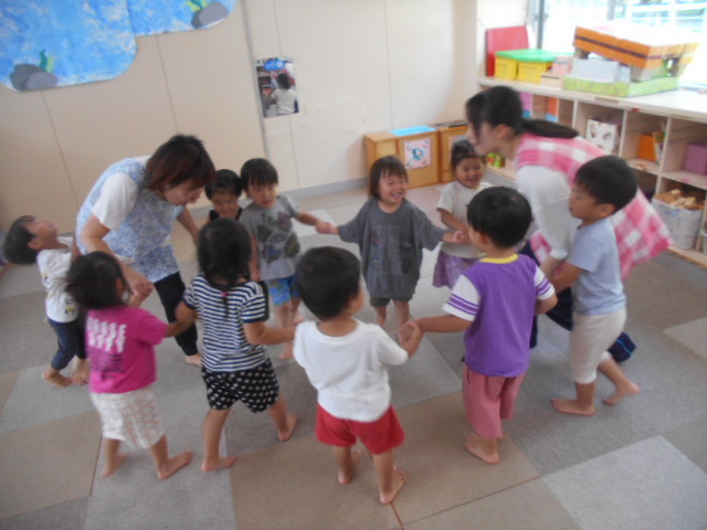 みんなで手をつないで輪になって、「おせんたくぎゅ~」と洗濯ごっこをしたり、お友だちと「ひっつきもっつき♪ひっつきもっつき♪」と歌いながらくっついたりして楽しかったよ(*^^)「もういっかいしたい~!」と大喜びの子どもたちでした♪