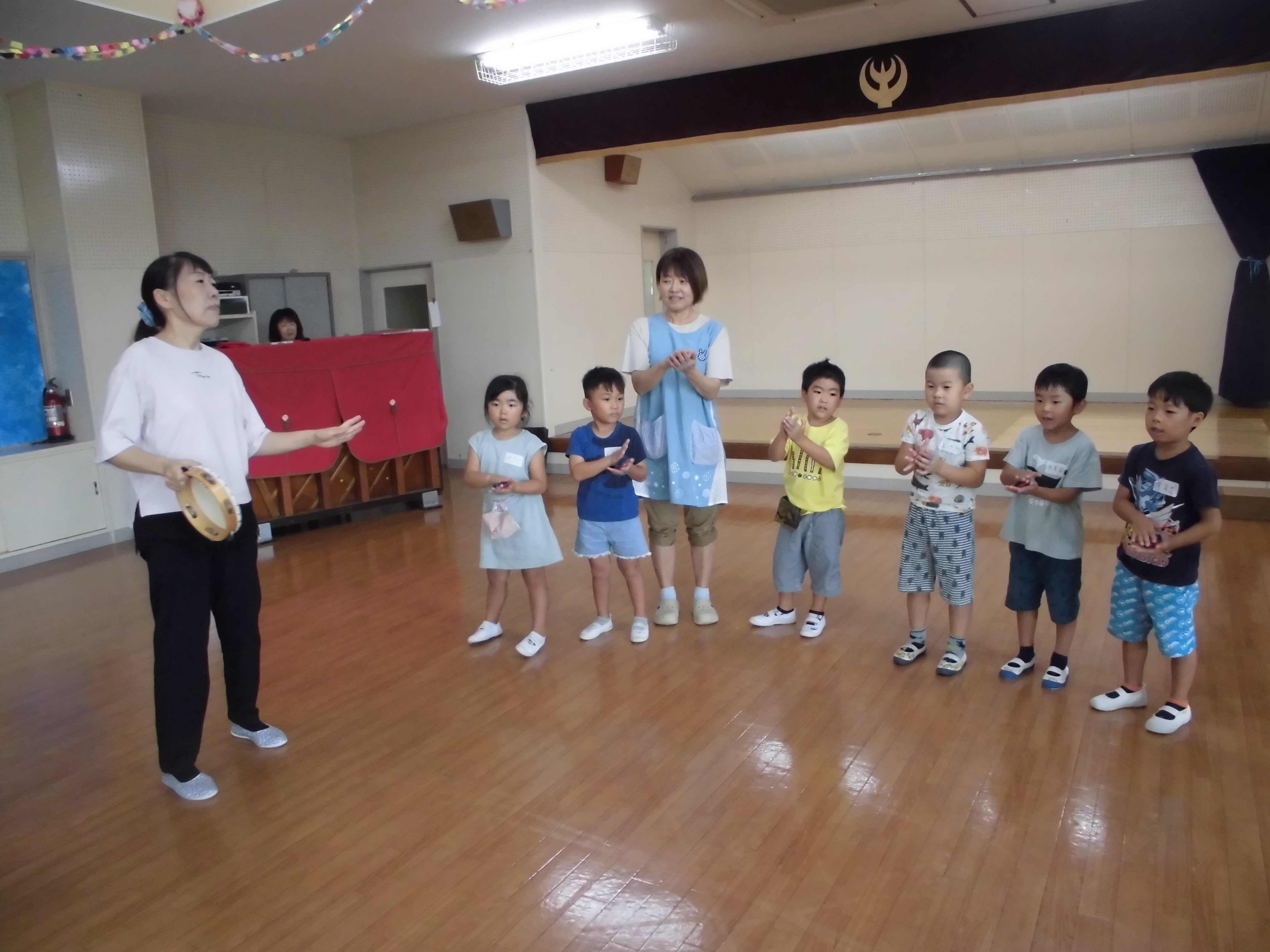 リトミックの先生が来てくれてピアノに合わせて体を動かしたり、楽器を鳴らしたりしました。2人ずつタンブリンを叩きながらみんなの周りを歩き自己紹介をしました。少し照れながらも好きな食べ物やあそびを教えてくれましたよ。カスタネットで「タンタンタン」のリズムを順番につなげていくのもおもしろがっていました(*^_^*)
