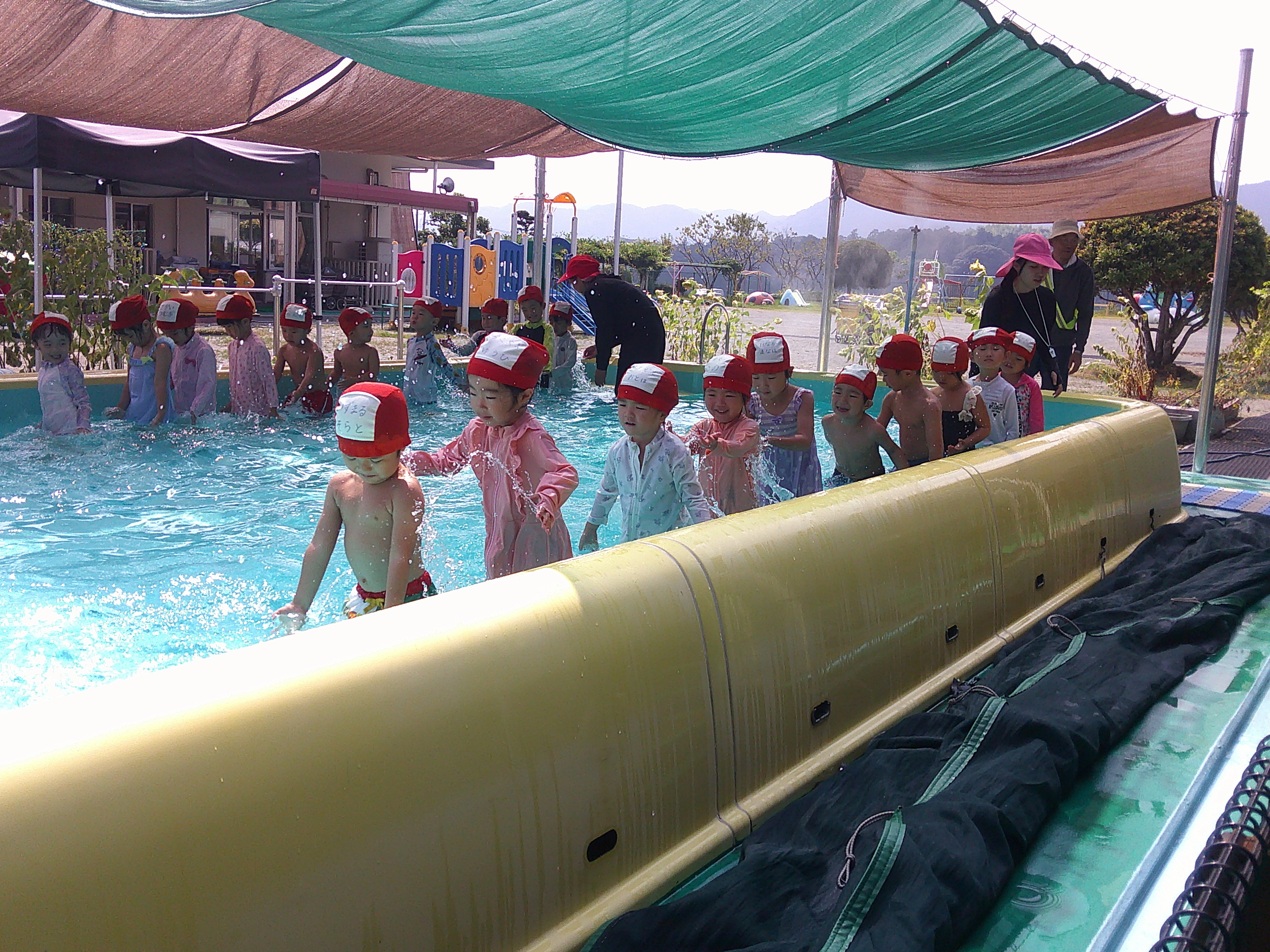 矢野の川まで網とバケツを持って遊びに行きました。川に入ると「つめたい!」と言いながらも嬉しそうな子どもたち(*^_^*)