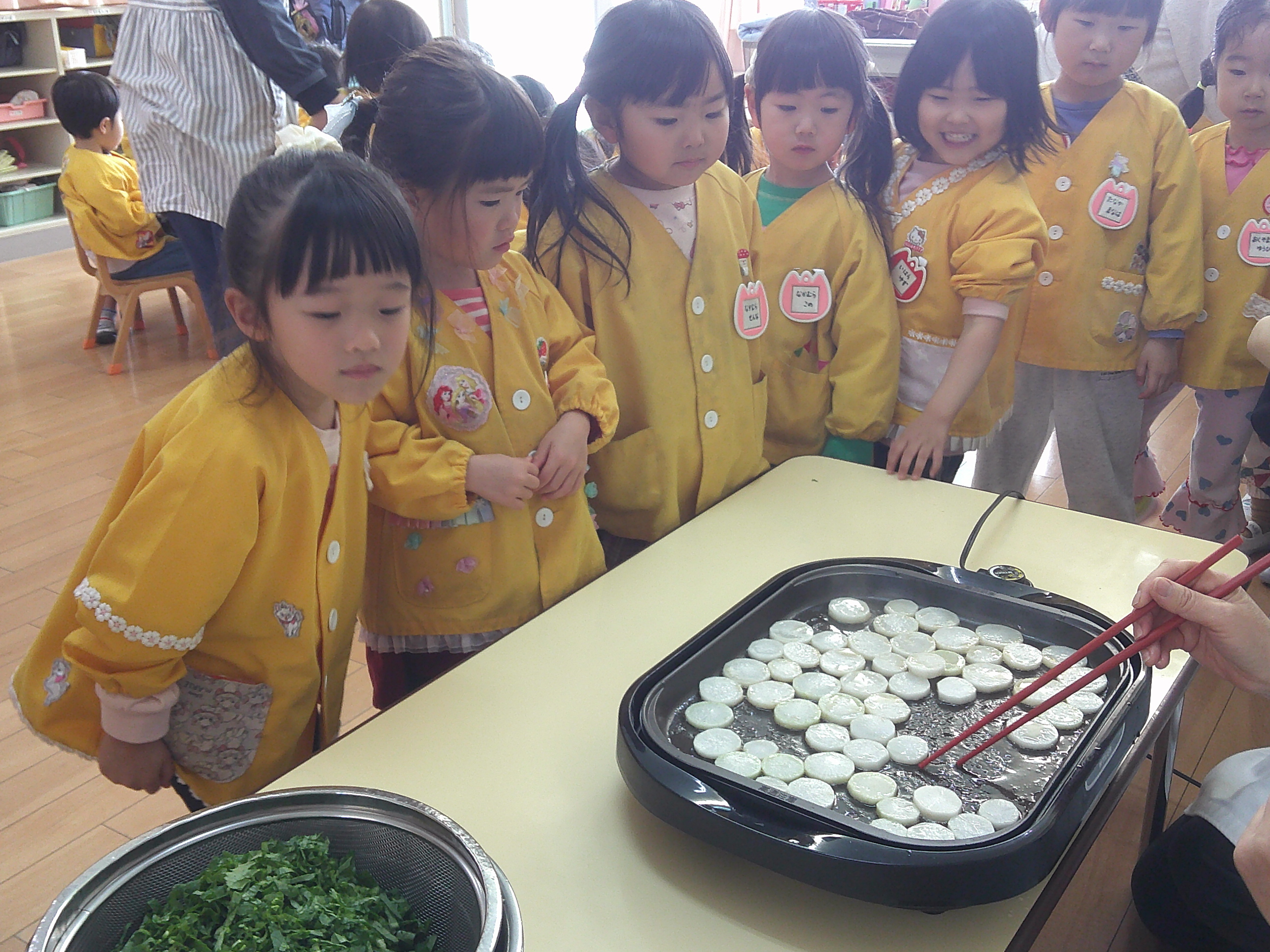 大根や大根葉を切る様子を見たり、輪切りした大根をホットプレートで焼いて「ごま油」と「塩」で味付けする様子を見ました。ブロッコリーも同じ味付けで食べました。