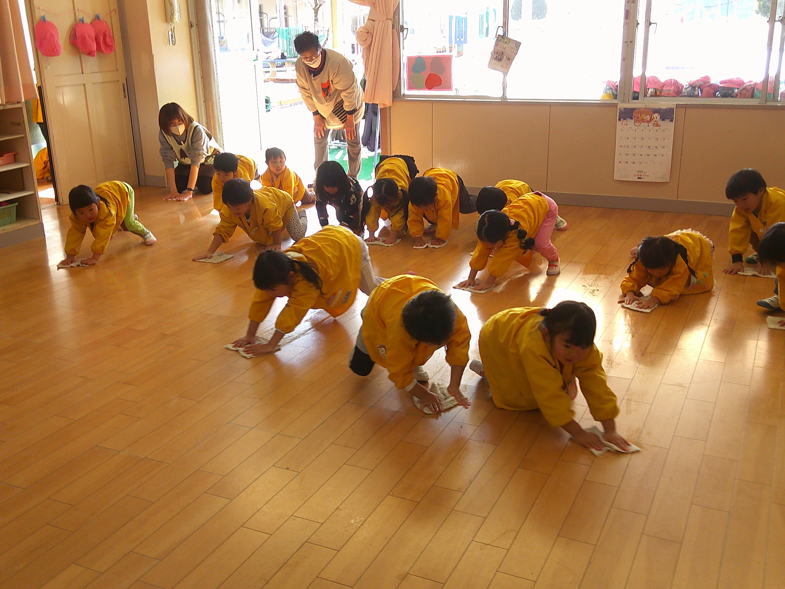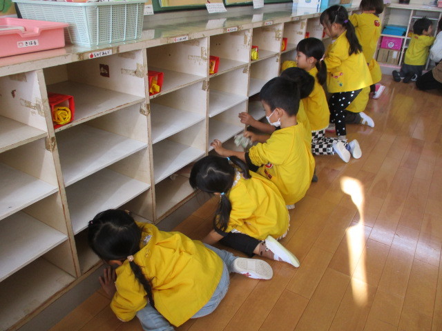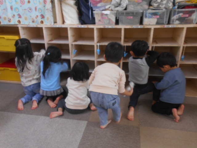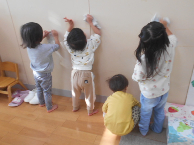 一人一枚雑巾を持って、毎日使っている自分のロッカーや棚の中などをきれいに拭きました♪「ゴシゴシ~」「きれいになあれ~」など言いながら一生懸命拭き掃除をしてくれましたよ☆