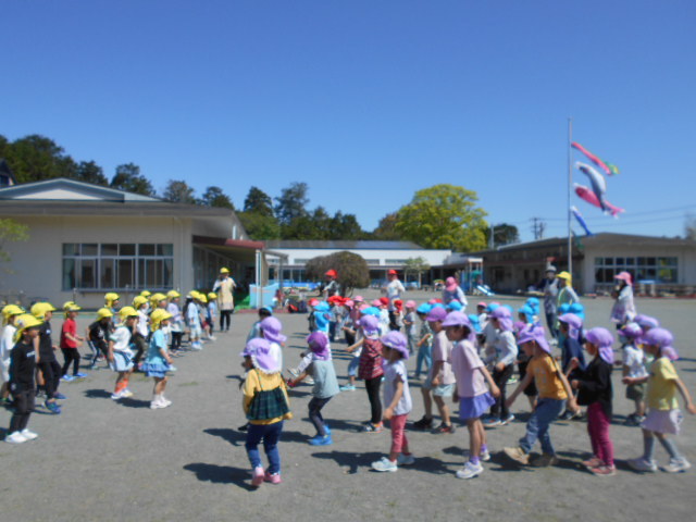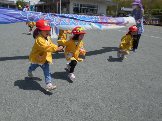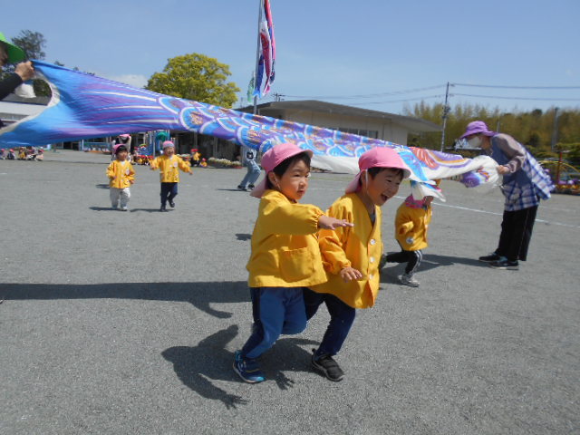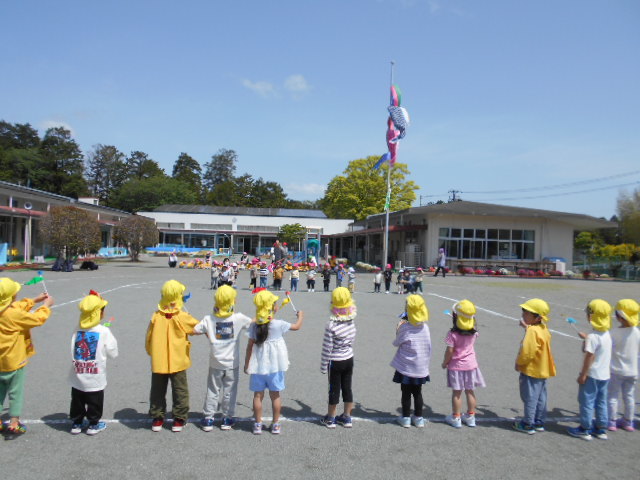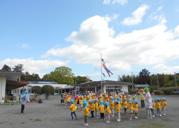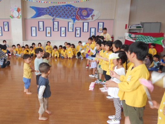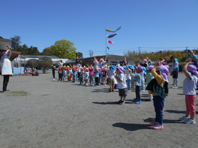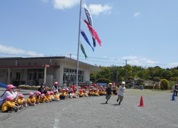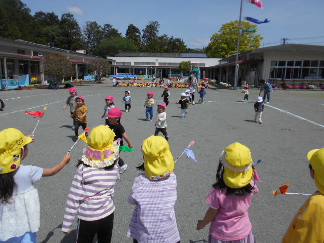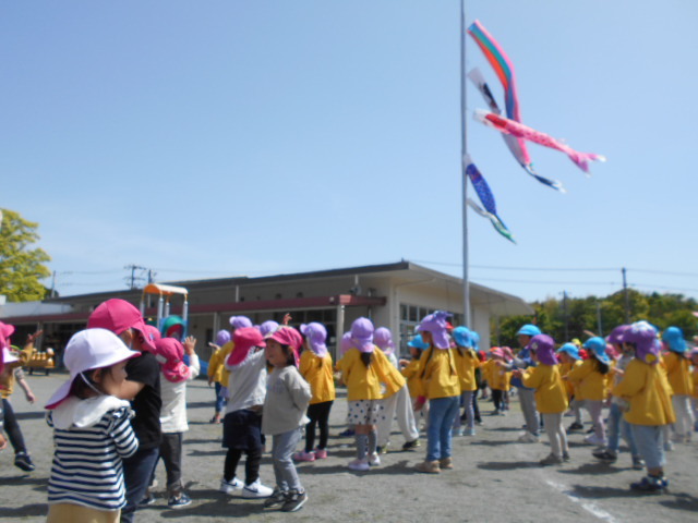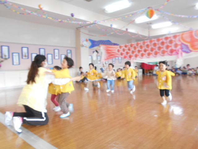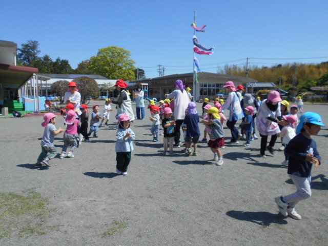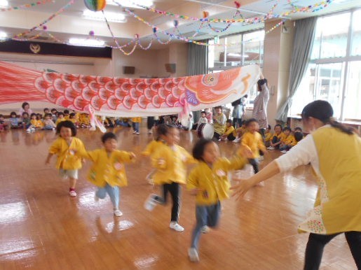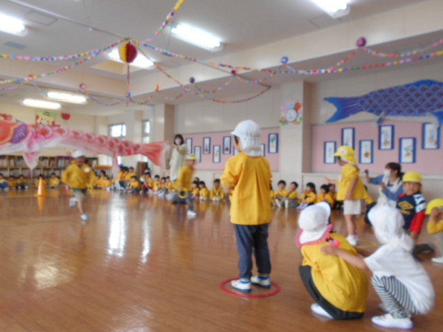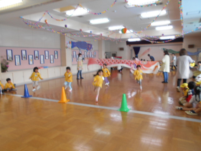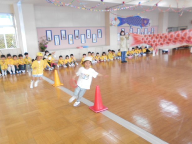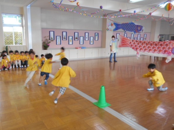歌をうたったり体操したり、こいのぼりかけっこで大喜び。年中組さんは、三角コーンを上手に周っていました!!