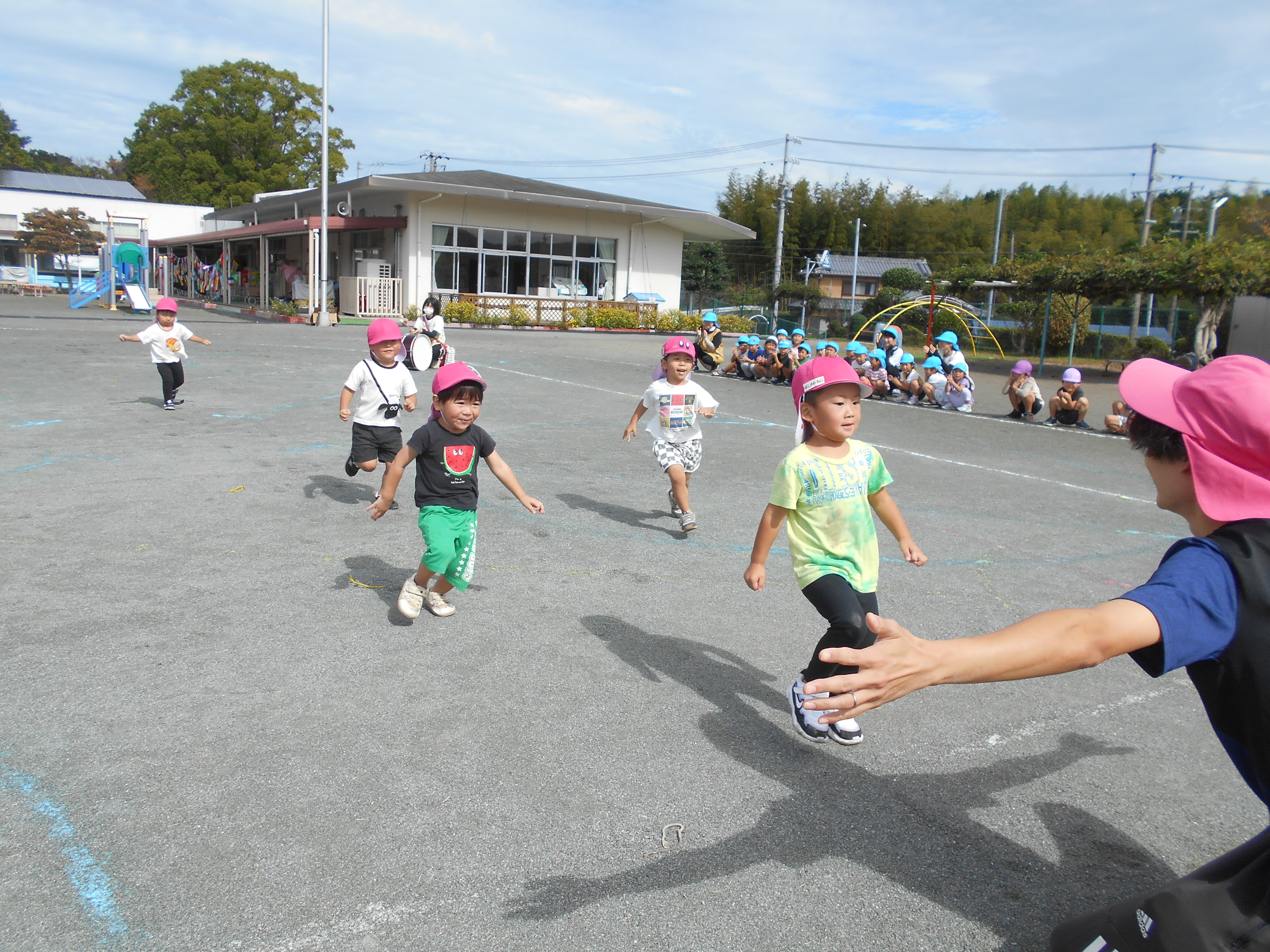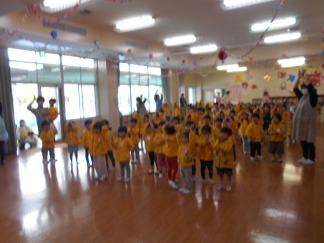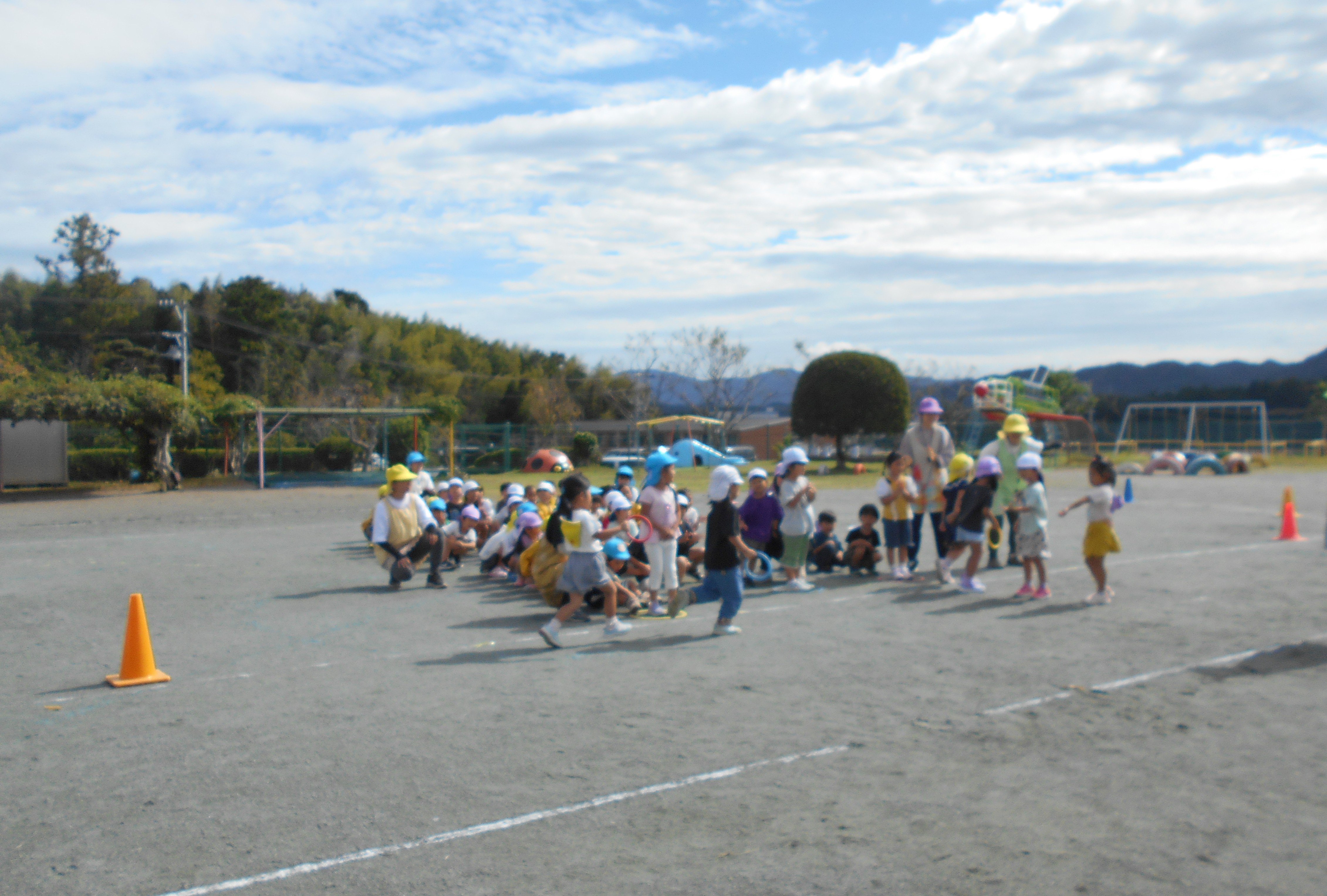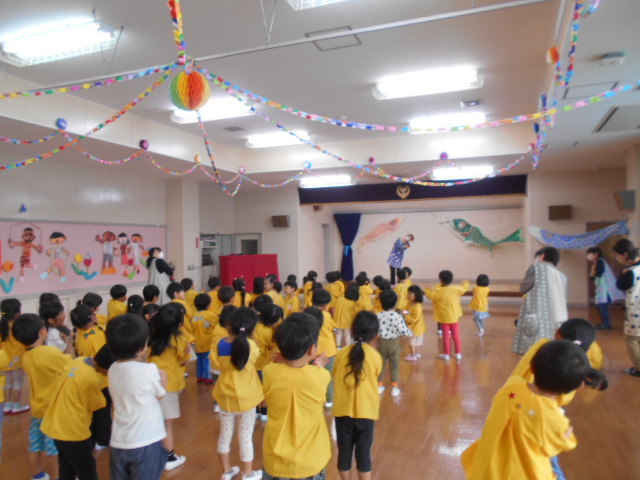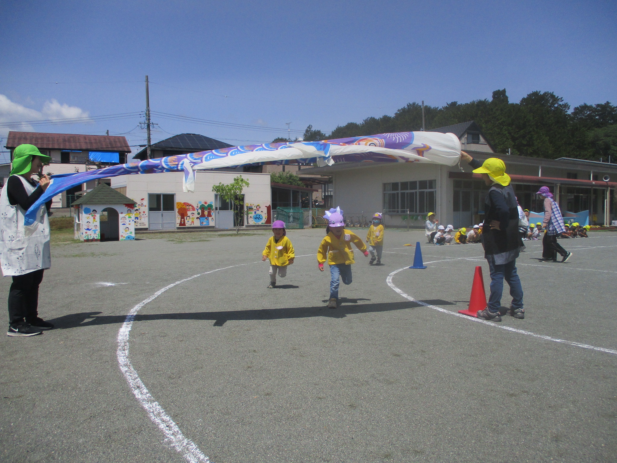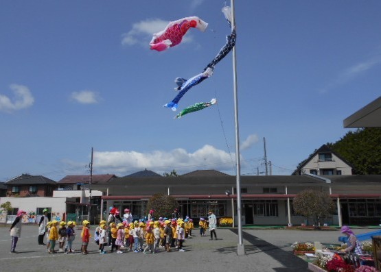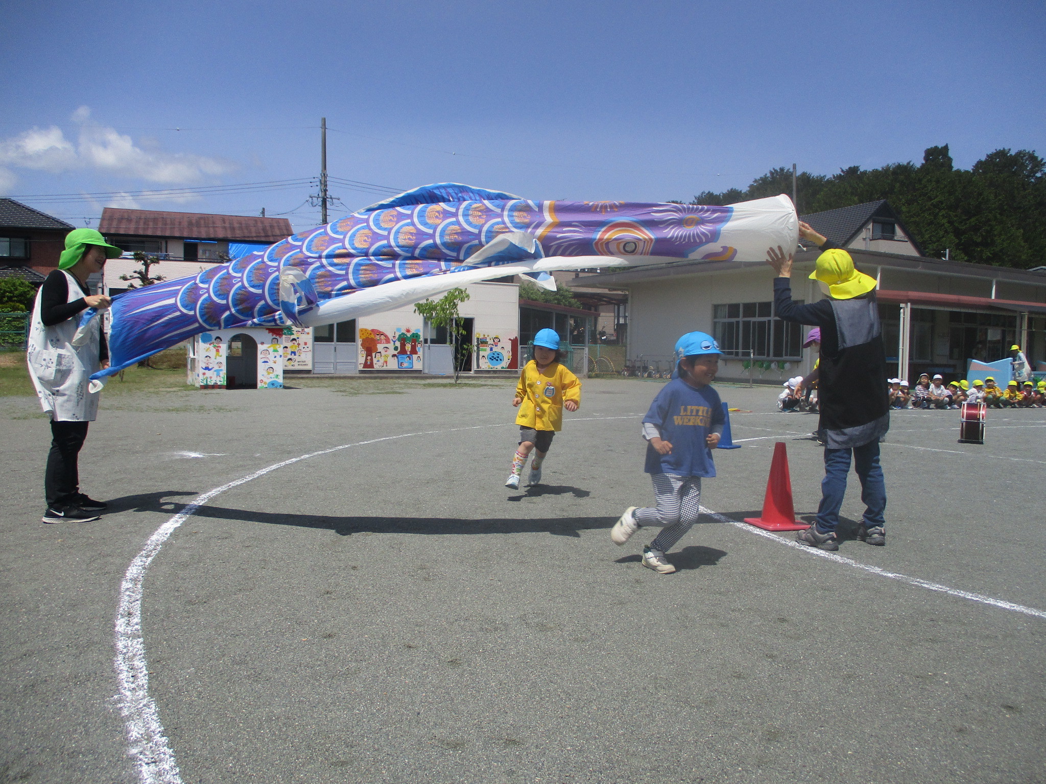 歌をうたったり体操したり、こいのぼりかけっこで大喜び。年中組さんは、三角コーンを上手に周っていました!!