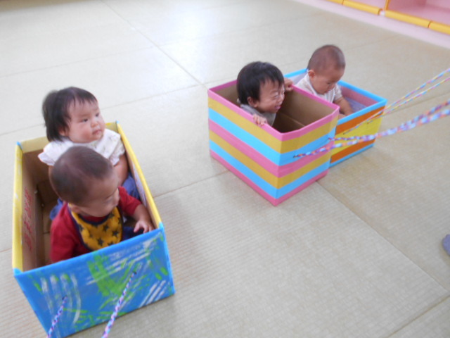 みんなでダンボール電車に乗ったよ。出発進行~