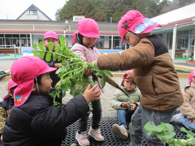 とても大きな大根を見て驚いた様子の子どもたち。張り切って抜いたり運んだりしていましたよ!