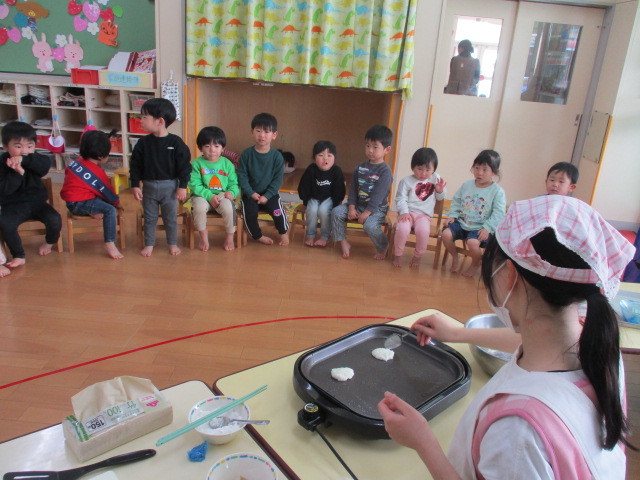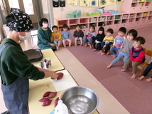さつまいもを切ったり焼いたりするところを一生懸命見る子どもたち♪「せんせいがんばれ」「じょうずやなぁ」とたくさん声をかけてくれました☆ホットプレートの蓋を開けると「わー!いいにおいする」と大喜びでした(^^)