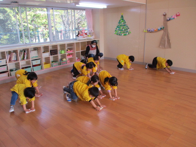 遊戯場でも体操を楽しみました♪ 元気いっぱいの子どもたち、曲に合わせてどんどん弾け、とってもいい顔で楽しんでくれています。なかなか自分を出せなかったり、見て楽しんだり・・・と表現は様々です。その子その子に合った「楽しい」を大切にしていきたいです。