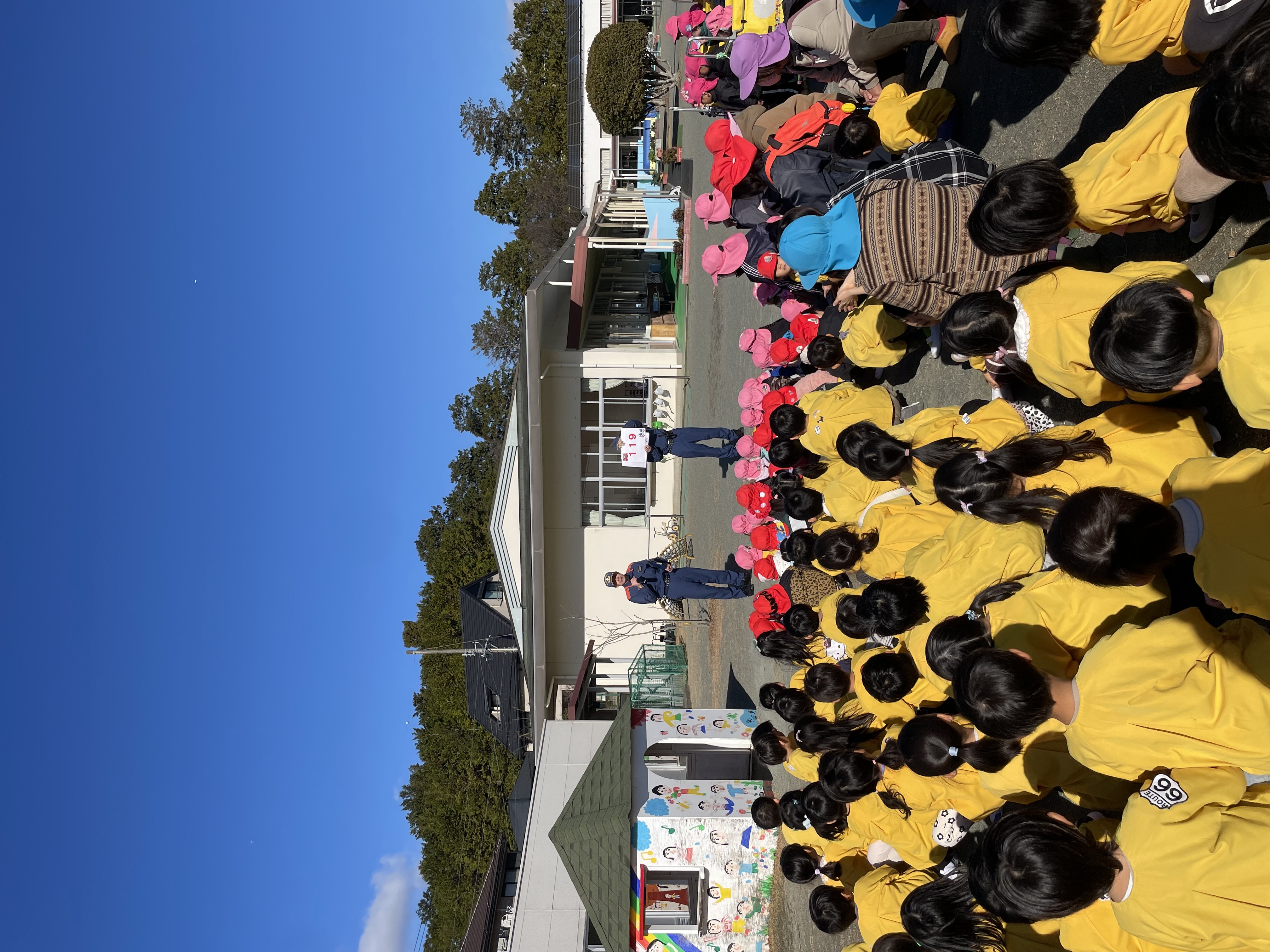 「緊急車両を呼ぶときは、119番」「お・は・し・も の約束(おさない、はしらない、しゃべらない、もどらない)」「火遊びをしない」とイラストを使って話していただき、みんな集中して聞いていました。
