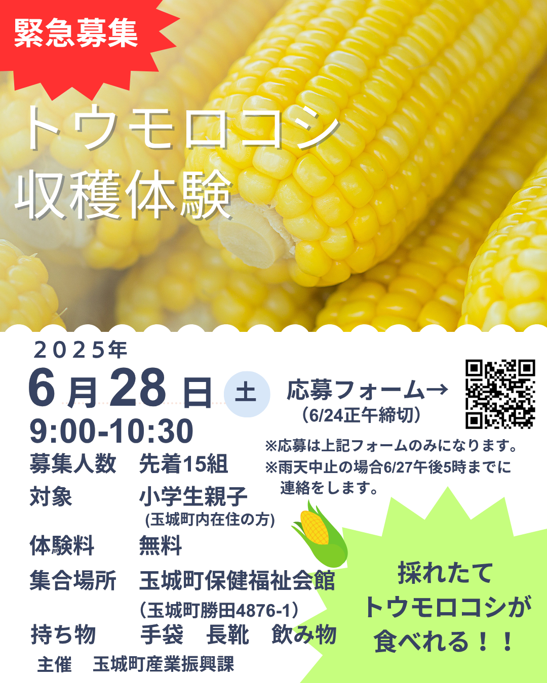 小学生親子で参加できる、トウモロコシ収穫体験を開催します。