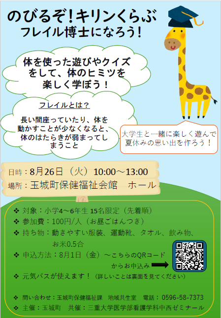 三重大学医学部看護学科の学生さんと一緒に、楽しく身体を動かしながら、身体が強く元気になるためにはどうすればよいか!?が学べる講座です。お昼には、フレイルサポーター特製ランチ付。ぜひ、この機会にお友達を誘ってご参加ください。