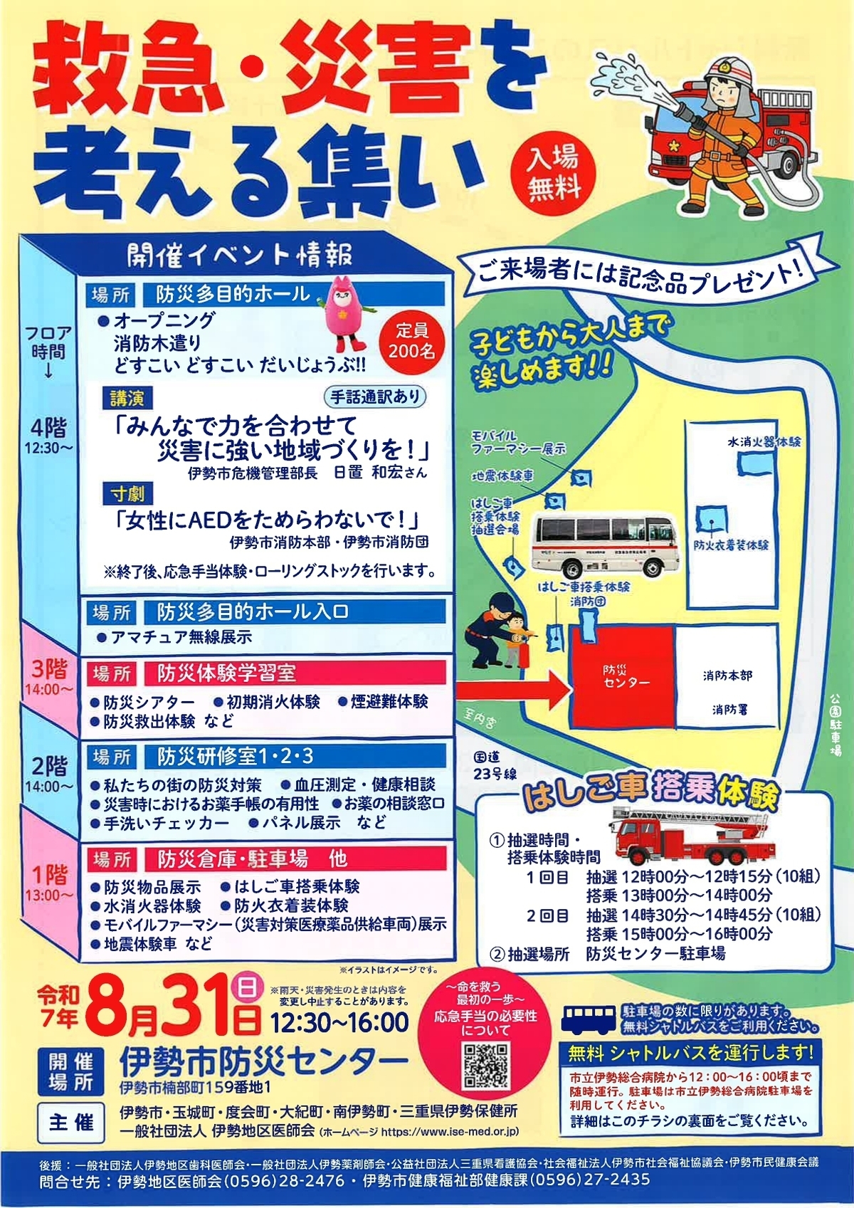 講演「みんなで力を合わせて災害に強い地域づくりを!」や防災体験、はしご車搭乗体験(抽選)など、子どもから大人まで楽しめるイベントです。どなたでもご参加できますので、ぜひお越しください。