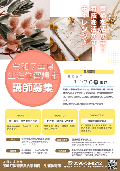 取得した資格を活かしたい方、仕事や趣味で見つけた特技を活かしたい方など、ぜひ玉城町の生涯学習講座の講師にお申込みください。